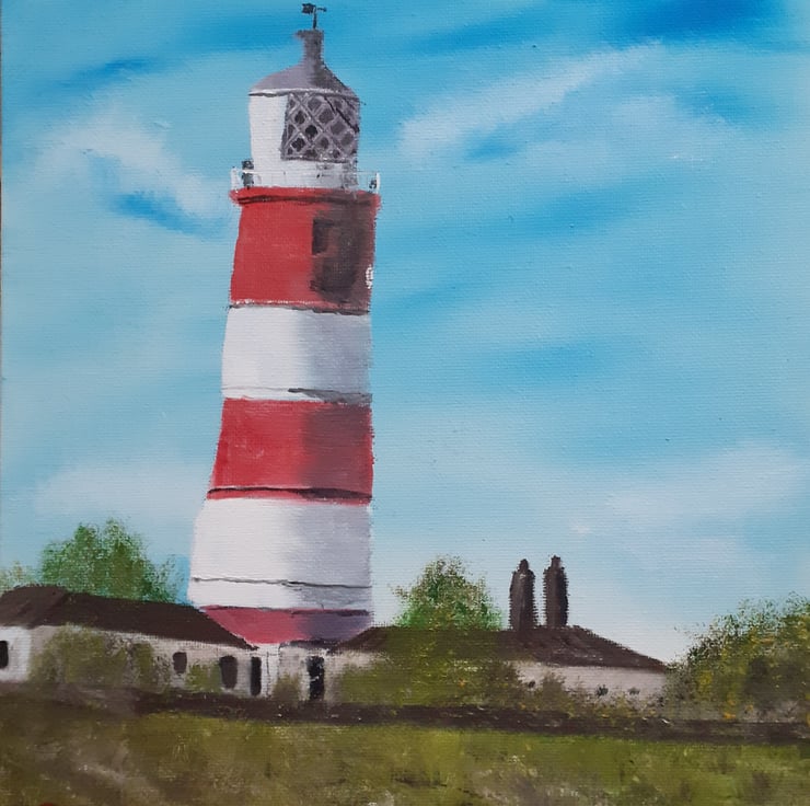 This delightful Red and White striped Lighthouse is painted on canvas board in Black Mount and can be framed. It is original and signed, 12"by10" in mount a total size of 16"by12 ".