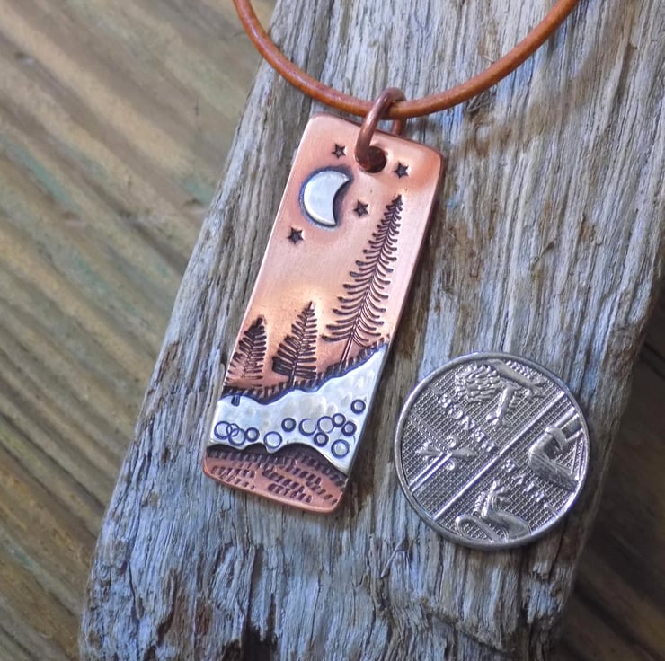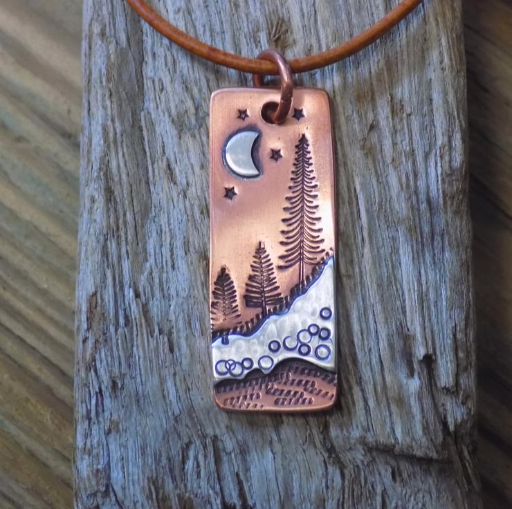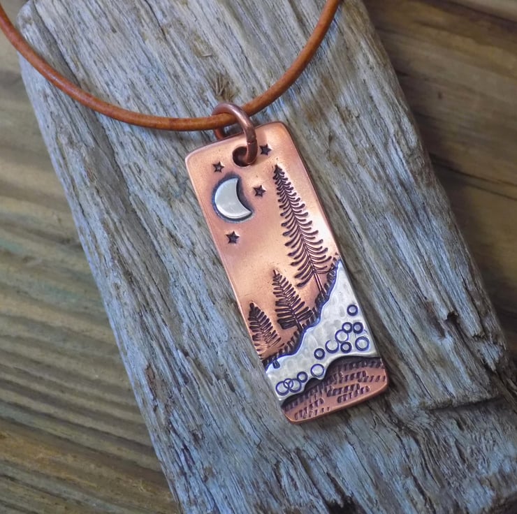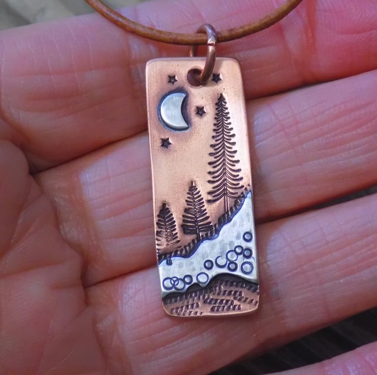 Made from 1.2 mm copper and a layer of sterling silver sheet. The layer of silver has been carefully soldered to the middle of the pendant which has a dappled finish to give the effect of snow with added texture and alpine trees in the back ground. A little silver crescent moon and stars set the scene. Simply hung on an adjustable vintage brown leather necklace with extender chain with weighted aqua coloured bead 16-18 ".