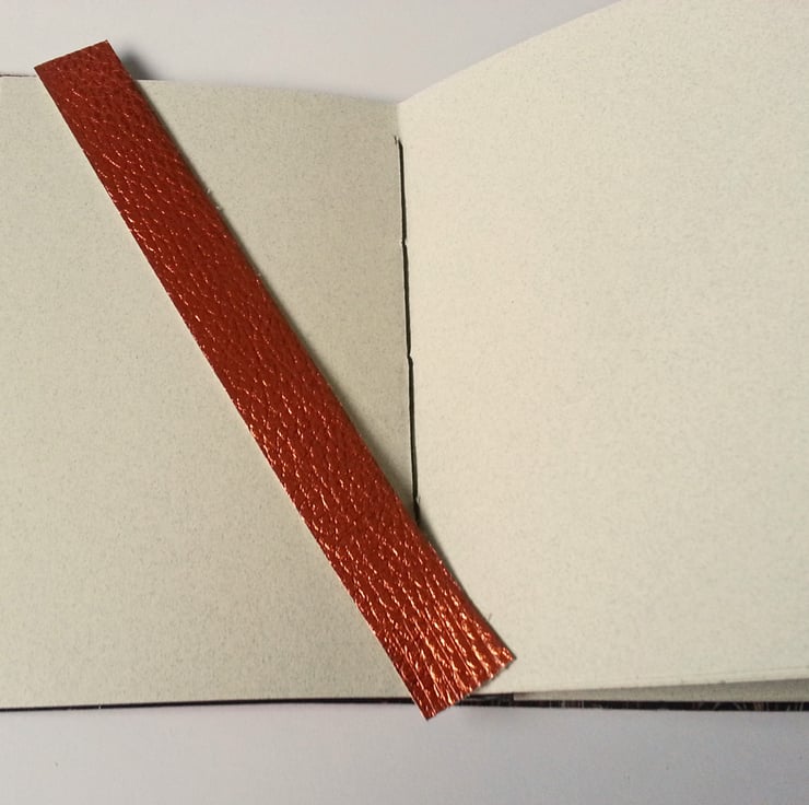 - There is a matching bookmark cut from the same piece of leather, with a fringed end.