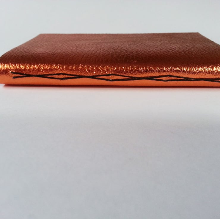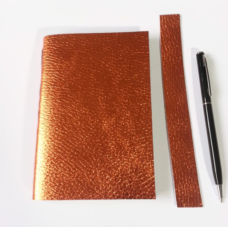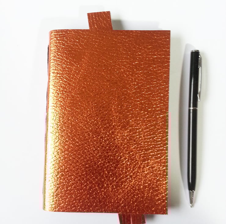 - The cover is soft, thick leather with a grained finish, in a metallic copper / rose gold finish.