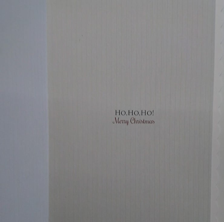 The inside of the card has a double full colour insert and has a printed greeting "Ho Ho Ho Merry Christmas". There is plenty of room for you to write your own special message.