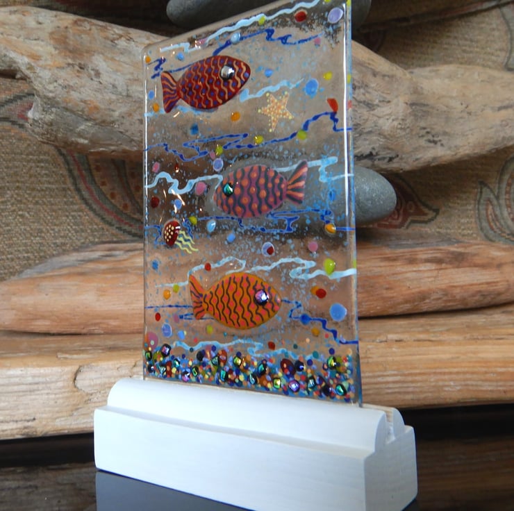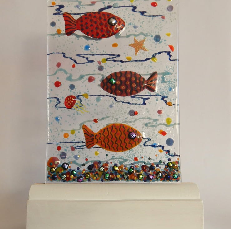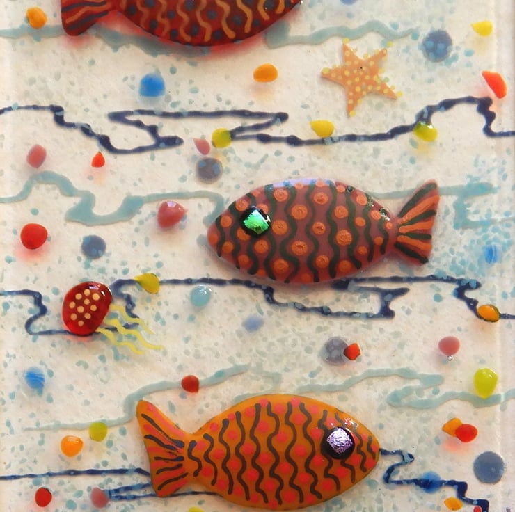 This picture has been made with extreme enthusiasm. It is almost a frenzy of colour and organised chaos. I endeavoured to squeeze in as much colour as I could without making it too busy. I have used a variety of different glass types and techniques: glass sheet, glass stringers, frit, dichroic glass, and enamelling.
