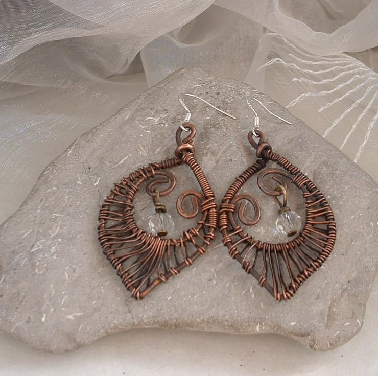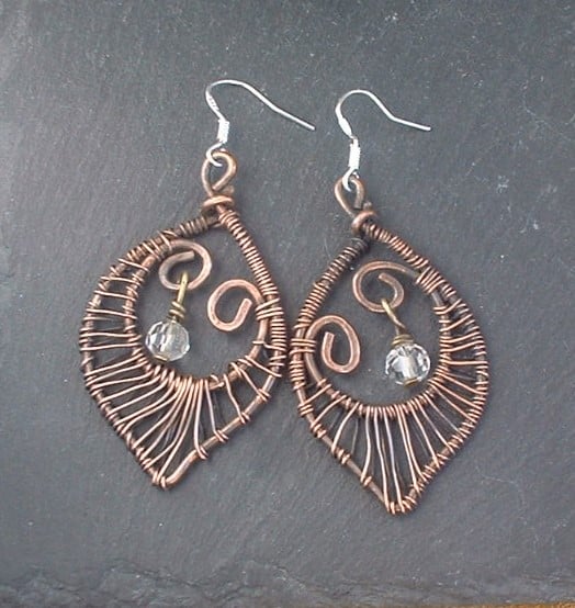 "Copper Leaf" Rustic Copper Wire Wrapped Earrings with Glass Bead Dangles