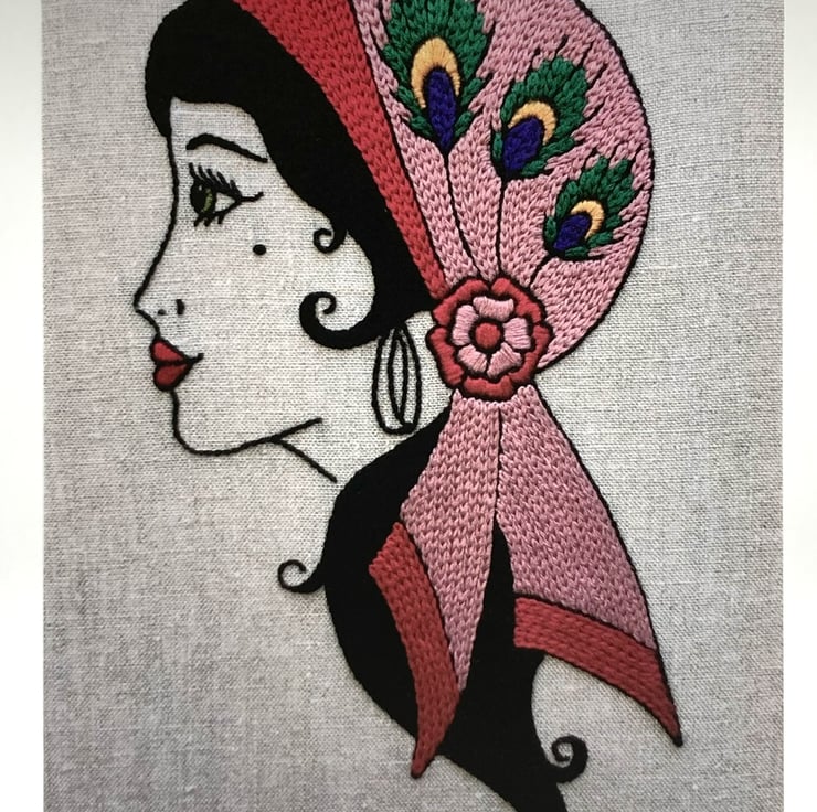 My obsession with tattoos lead me to create a drawing of a Gypsy woman in the old school tattoo art style, before hand embroidering her on a piece of raw linen.