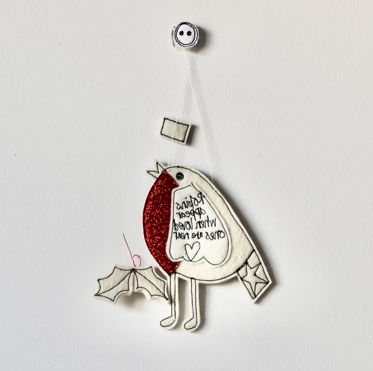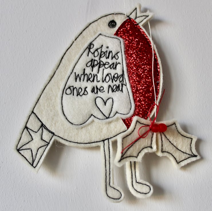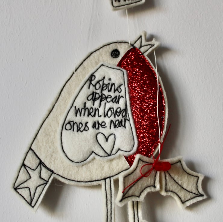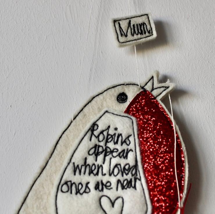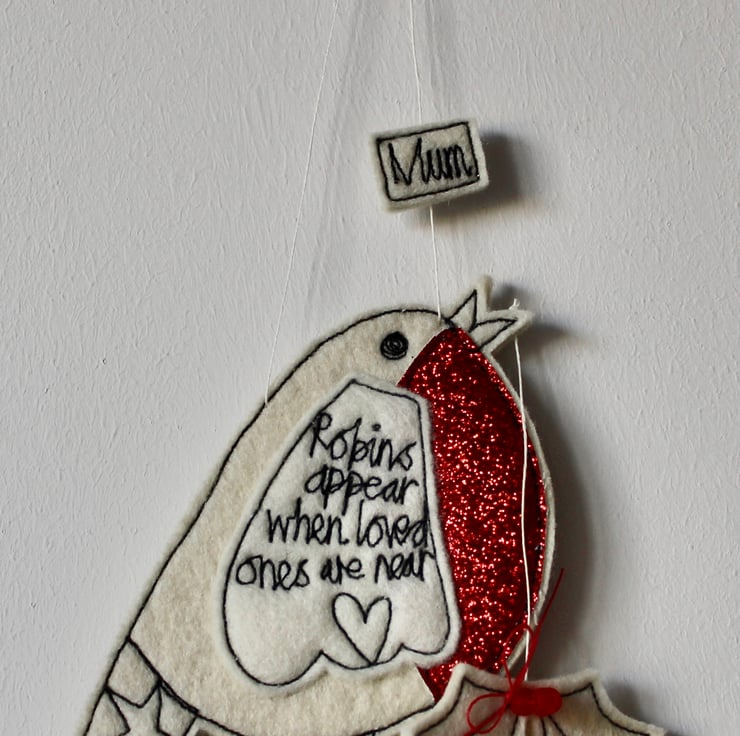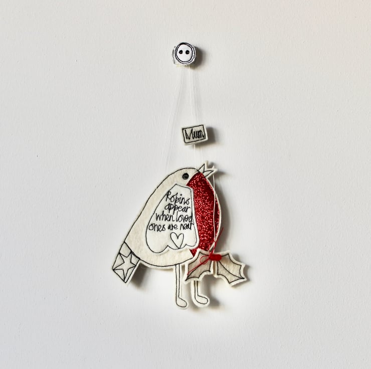 With a red glittery breast, Mr Robin has a star on his tail, holly suspended from his beak, the sentiment 'Robins Appear when Loved Ones are Near' sewn on his wing and the sewn word 'Mum'.