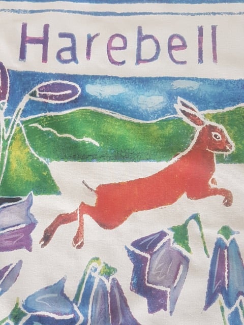 The image is part of the Proseprints, Flora and Fauna collection of original Lino prints and printed cards and celebrates the common names of well loved flowers that include an animal or an insect. A brightly coloured and playful image of a running brown hare amongst a meadow of harebell flowers and a perfect gift for nature lovers and cooks alike.