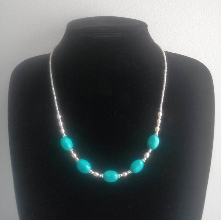 This beautiful necklace is made with natural stabilised turquoise ovals, freshwater seed pearls and sterling silver flower-shaped spacers and beads. It is threaded with tiny freshwater pearls to a sterling silver carabiner clasp and jump ring. All the additional findings used to make this necklace are sterling silver.