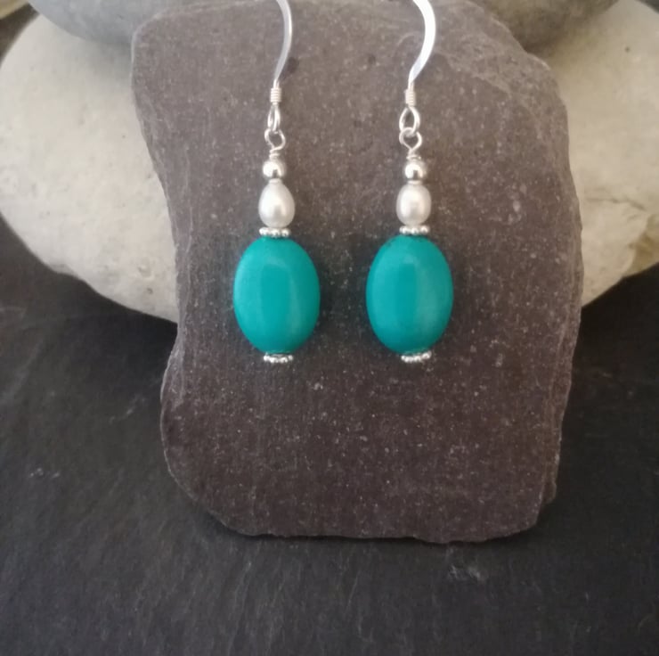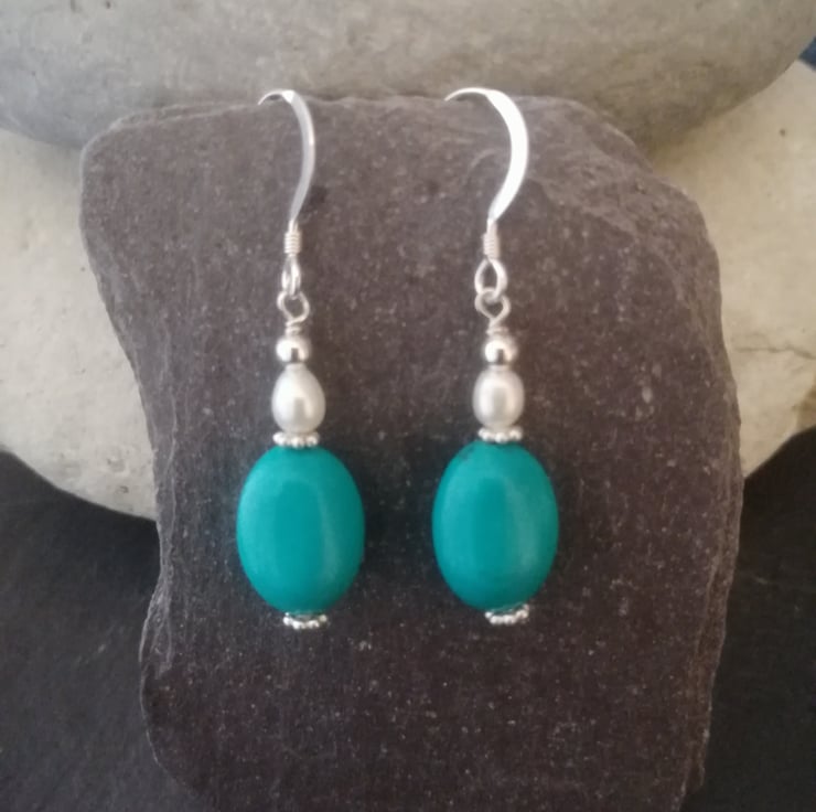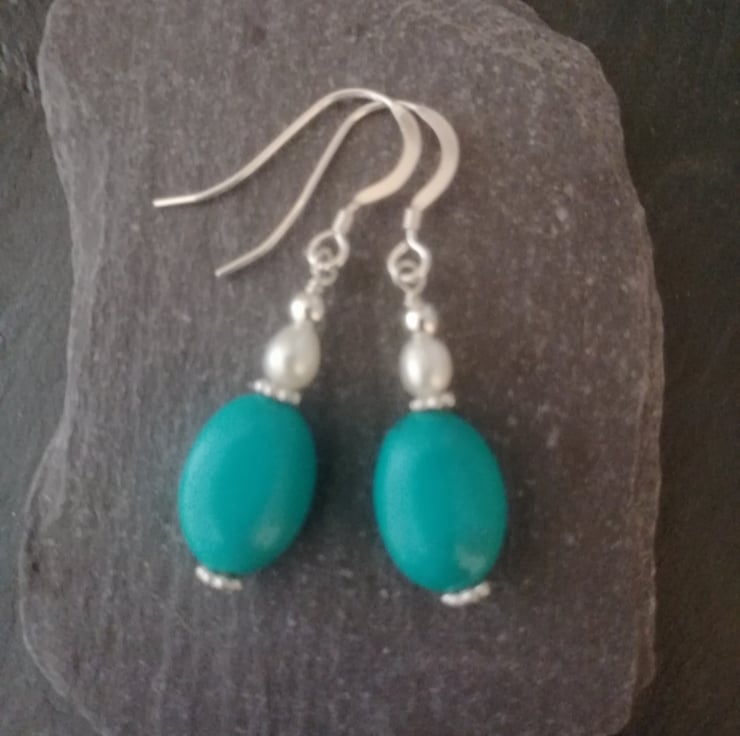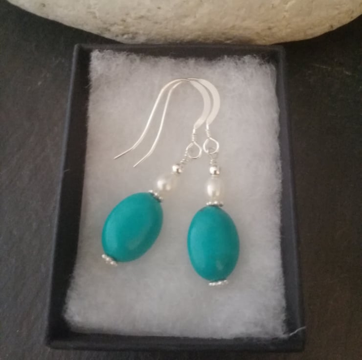 These beautiful earrings are made with natural stabilised turquoise ovals, freshwater seed pearls and sterling silver flower-shaped spacers and beads. The flat hook ear wire and headpin are sterling silver. The drop of the earrings from the top hoop is 26mm.