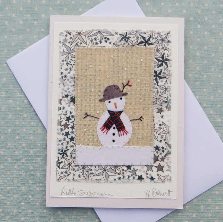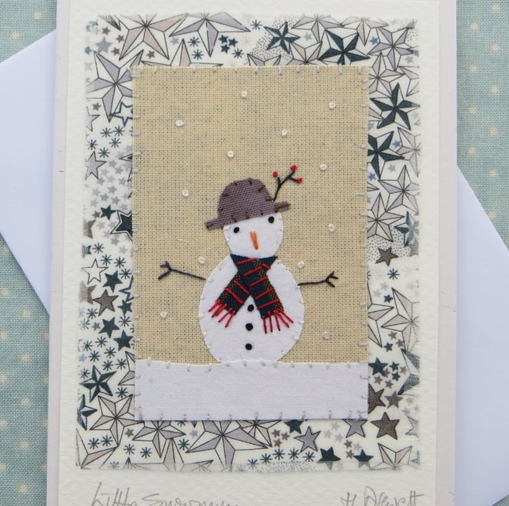 All my cards measure 12 x 9 cm and come with toning recycled paper envelopes in clear protective compostable cornstarch sleeves - no plastic! Each card is signed on the front and my studio stamp is on the back. Cards are made from stout 100% recycled card - blank inside. The title is written below the textile: 'Little Snowman'.