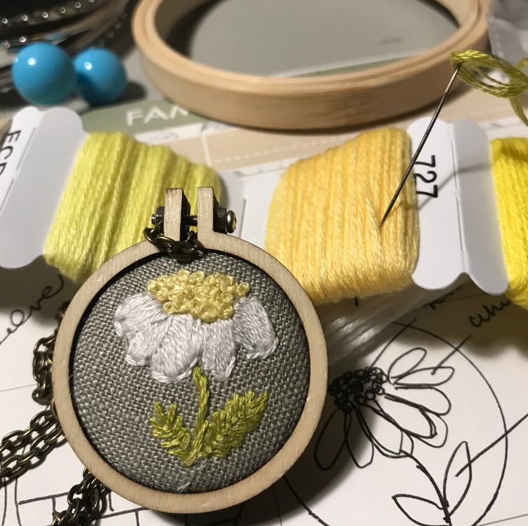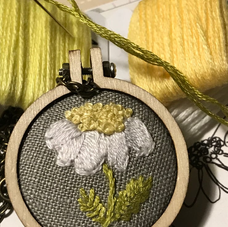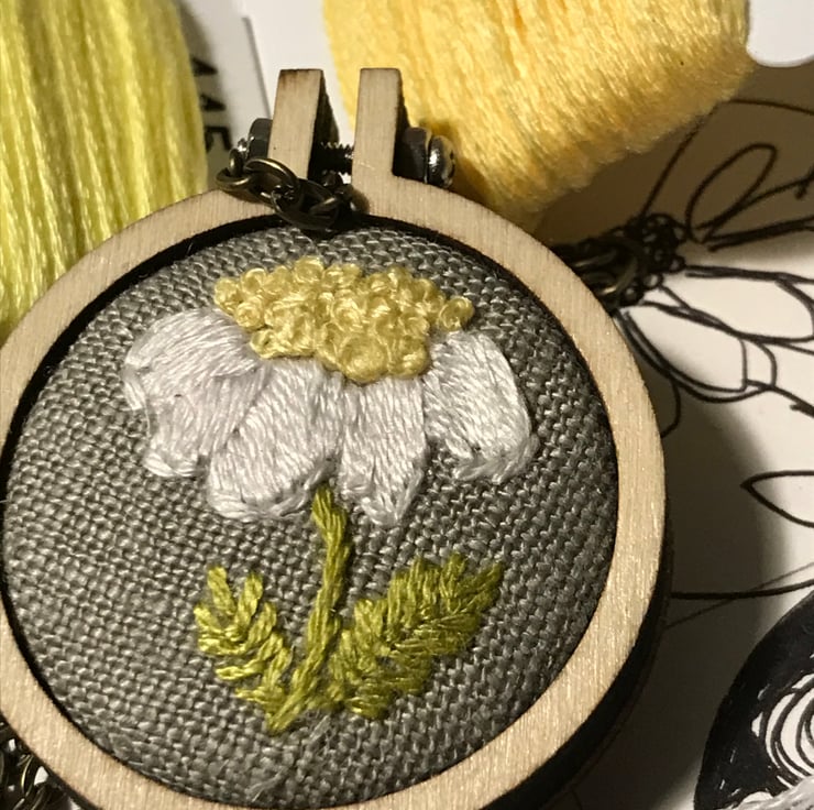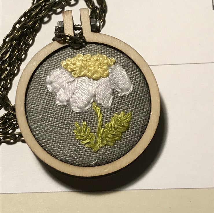 A Single daisy embroidered onto Grey Linen, set in a round wooden mini hoop, with a metal, antique bronze coloured chain. Giving a simple Daisy means -" In ancient Norse myth the daisy is sacred to Freya, who is a goddess of lots of cool things – including love. In the Victorian language of flowers, the daisy has a positive message of acceptance. If you give someone a daisy, it is a message that means “I like you too!” This could be in love and/or friendship"