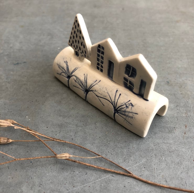 This little row of houses is hand built from white earthenware clay . Impressed designs have been added using my own handmade stamps and dried plants then decorated with dark blue underglaze .