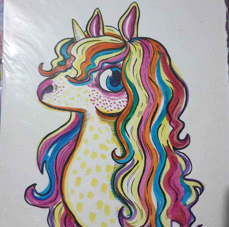 An original drawing of a rainbow haired unicorn with an envious fringe.