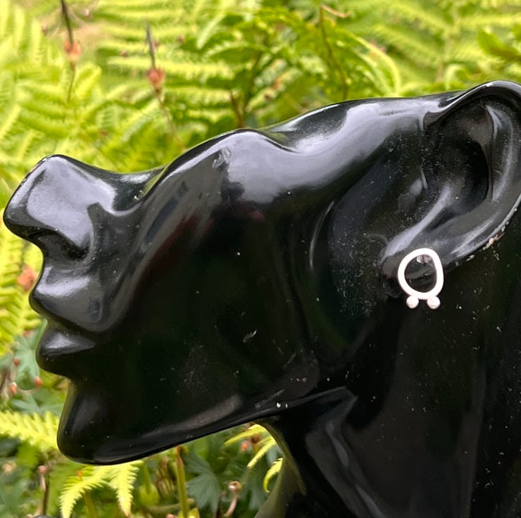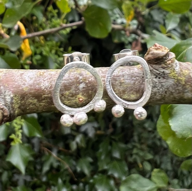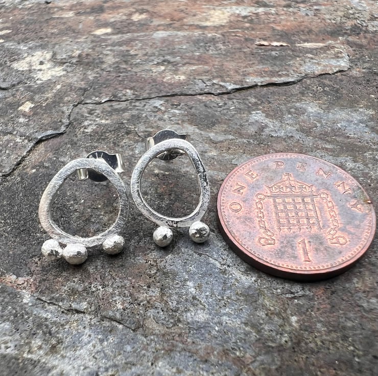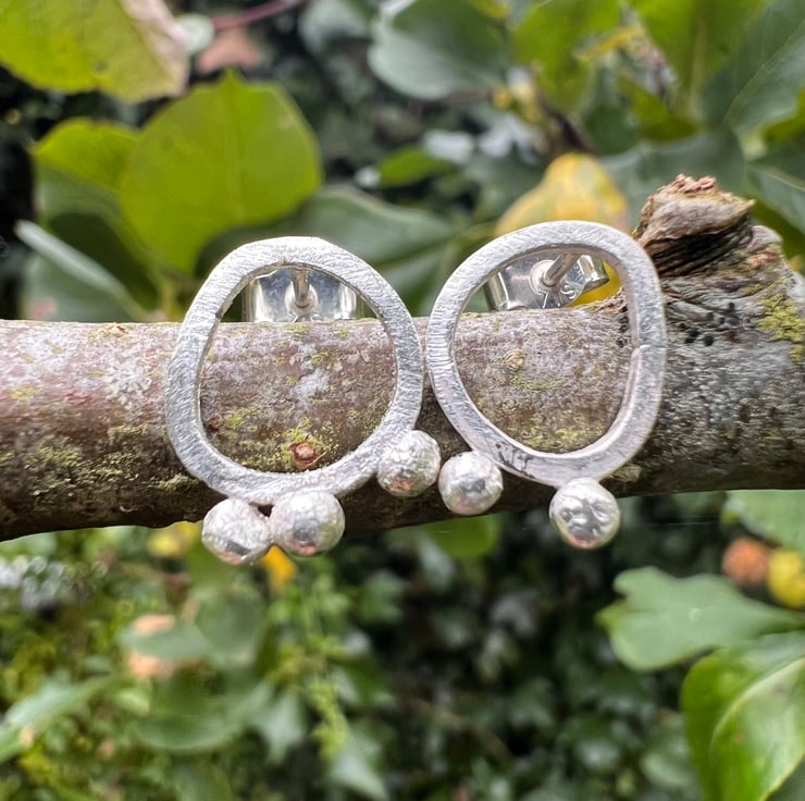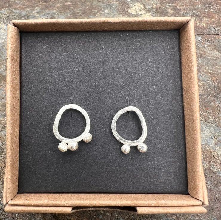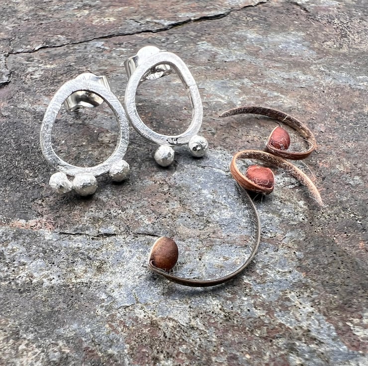 An organic oval shape, made with eco sterling silver square wire with 2 silver seeds soldered to the outer edge on one earring and 3 on the other; like the last seeds about to fall. I have given the facing surface a matt/ frosted texture.