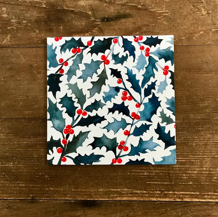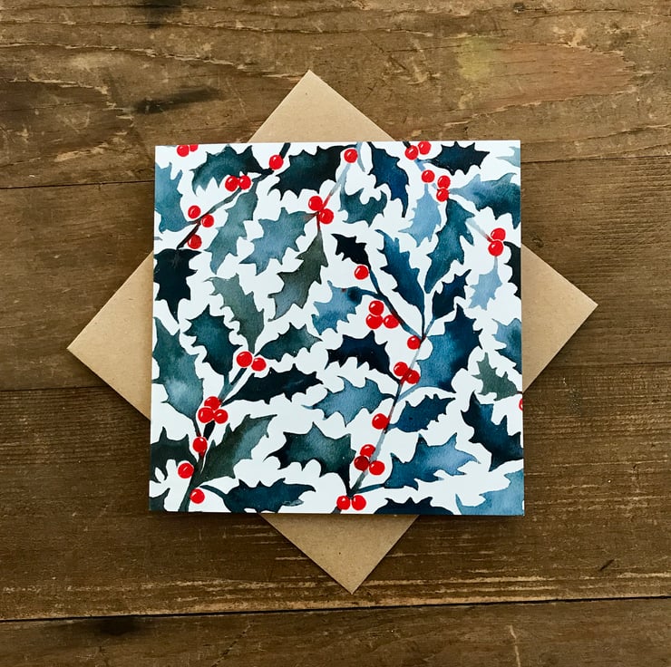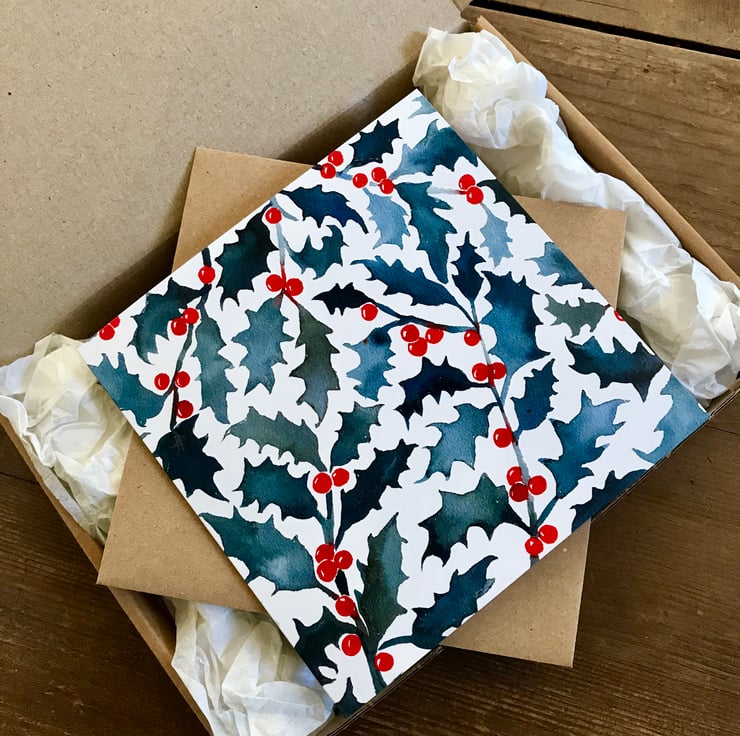 Set of 10 holly Christmas cards with recycled kraft brown envelopes