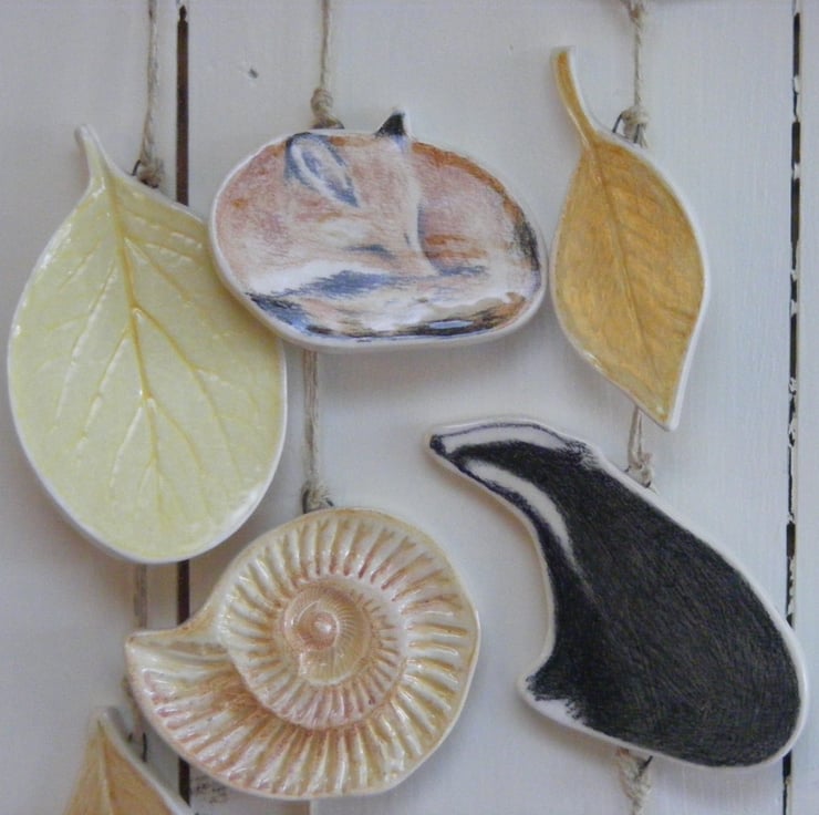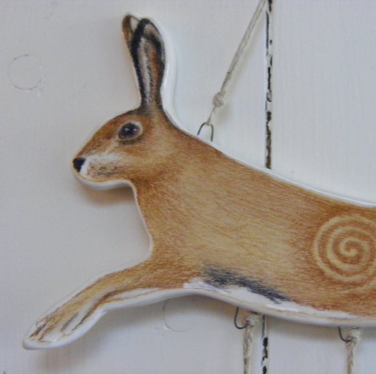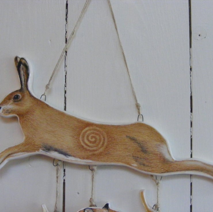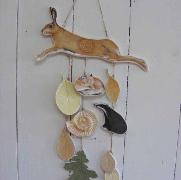 This piece is one of only 3 limited edition Into the Woods, Hare, Badger & Fox ceramic wall hangings. Each part is handmade in earthenware clay, hand painted individually, glazed and put together from an original design idea. The length of the ceramic is approx 15" plus the added cord for hanging. The width at the widest part , the hare is approx 9". Each piece is signed and numbered on the back. . The ceramic is hung from waxed cotton navy cord and is for inside decor only. This is NOT a toy. This is No.2 , No.1 is now sold.