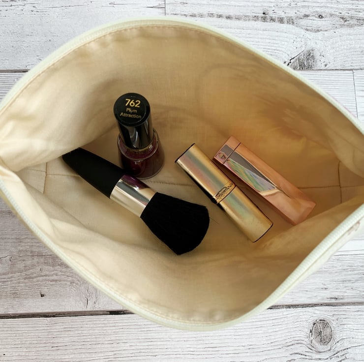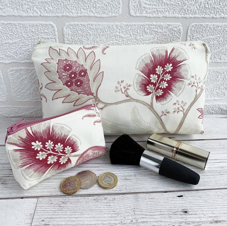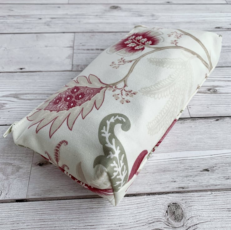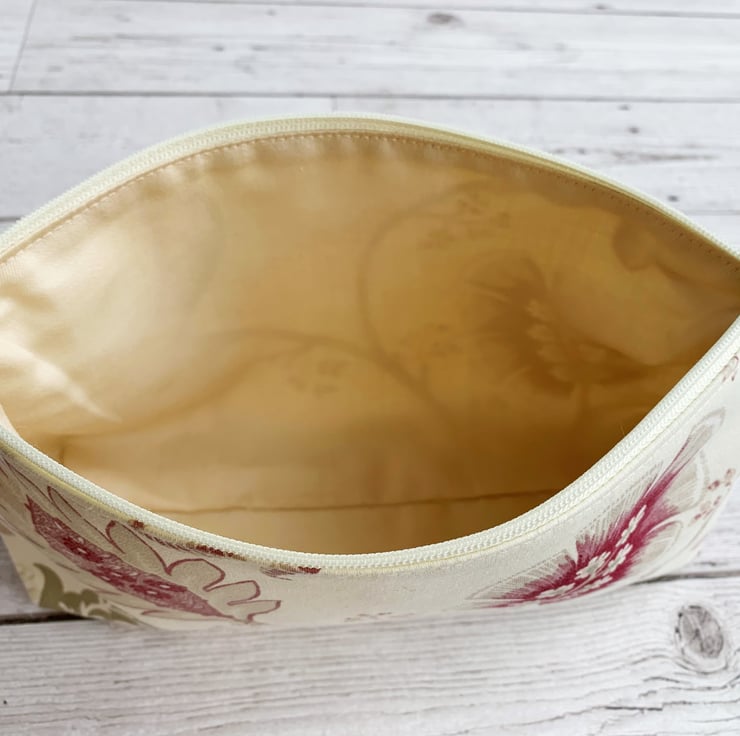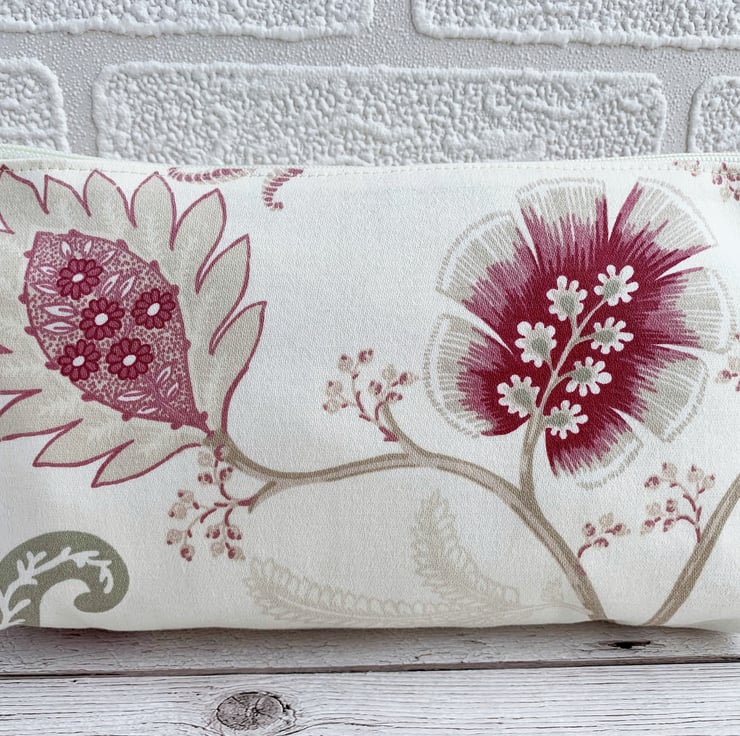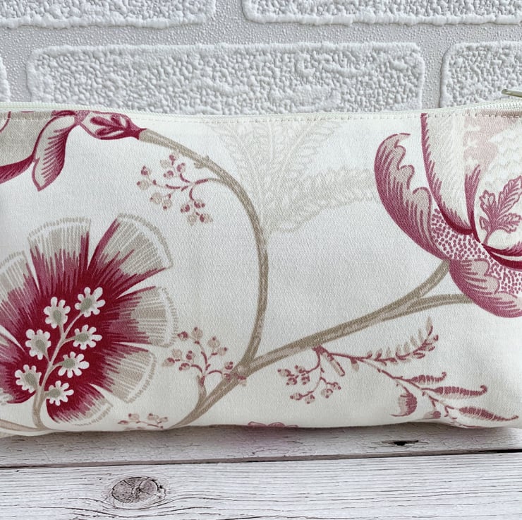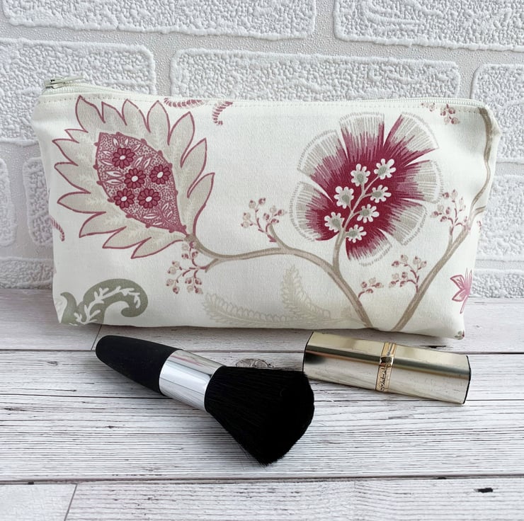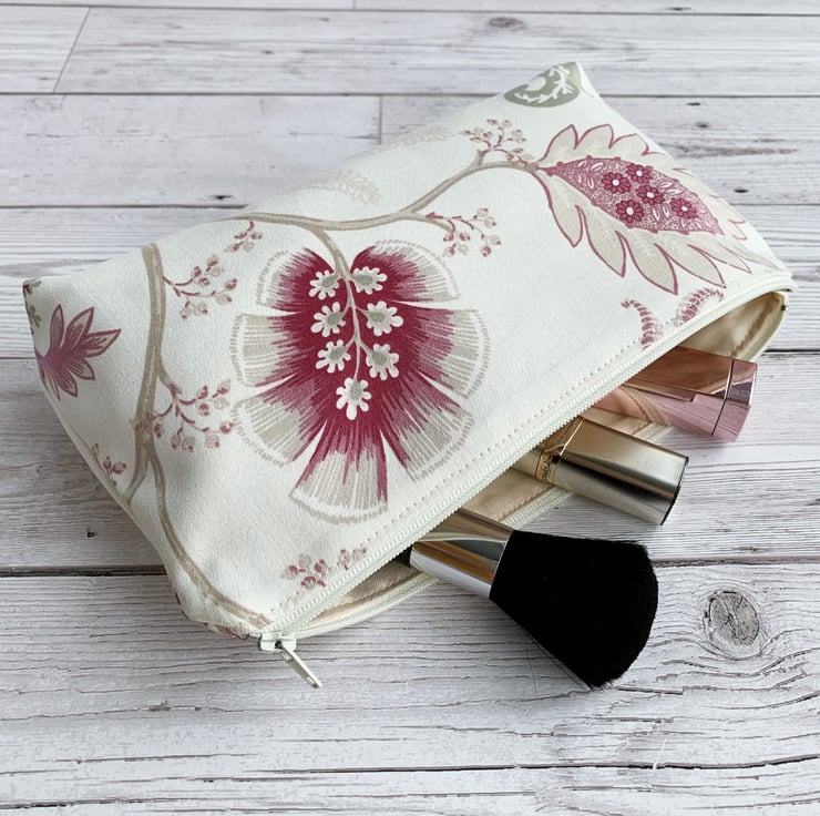 A make up bag with pink stylised flowers. This useful cosmetic bag is made from an attractive print fabric featuring a pattern of stylised flowers. The flowers, in shades of pink and beige on a cream background, sit on twining branches along with clusters of small leaves. Some of the shapes are similar to a paisley style pattern. The make up bag fastens with a cream zip and is lined with cream fabric. The base of the bag is boxed giving lots of room inside.