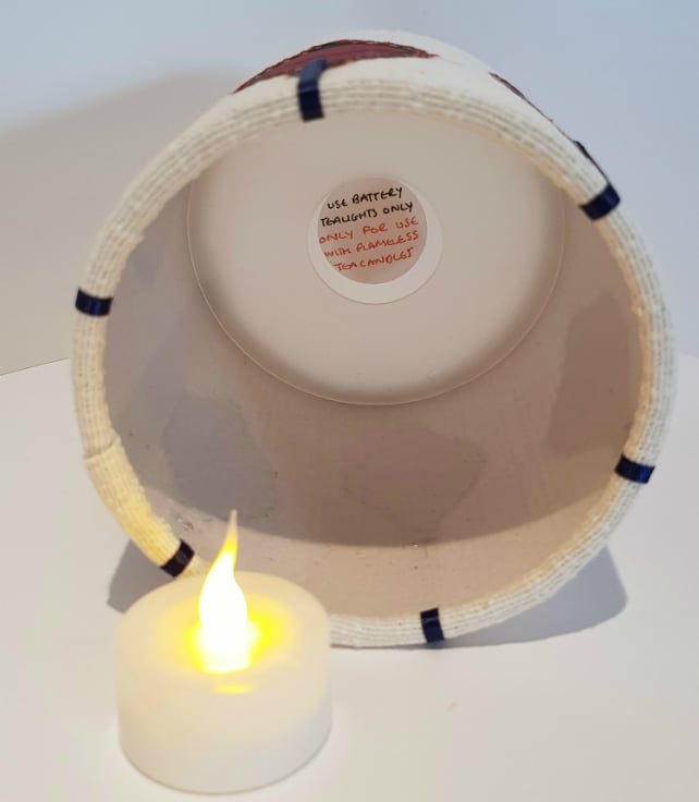 - Comes complete with a flickering LED tea light candle (with a screw-secured battery cover)