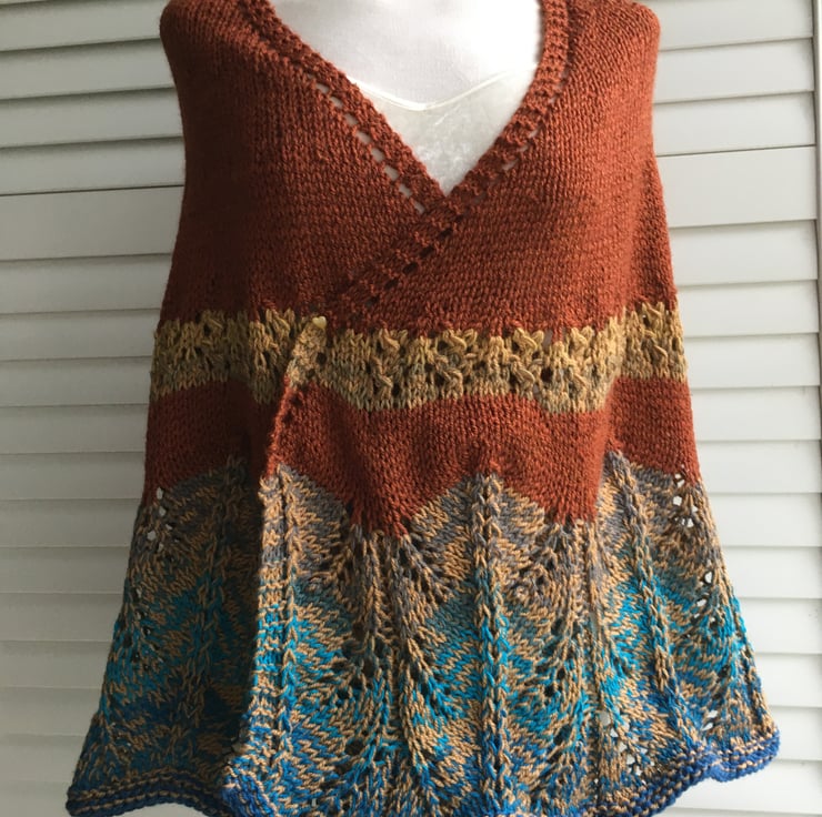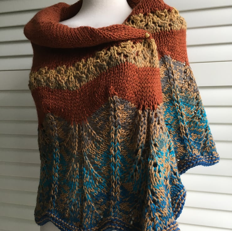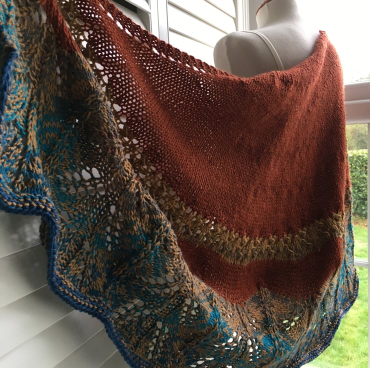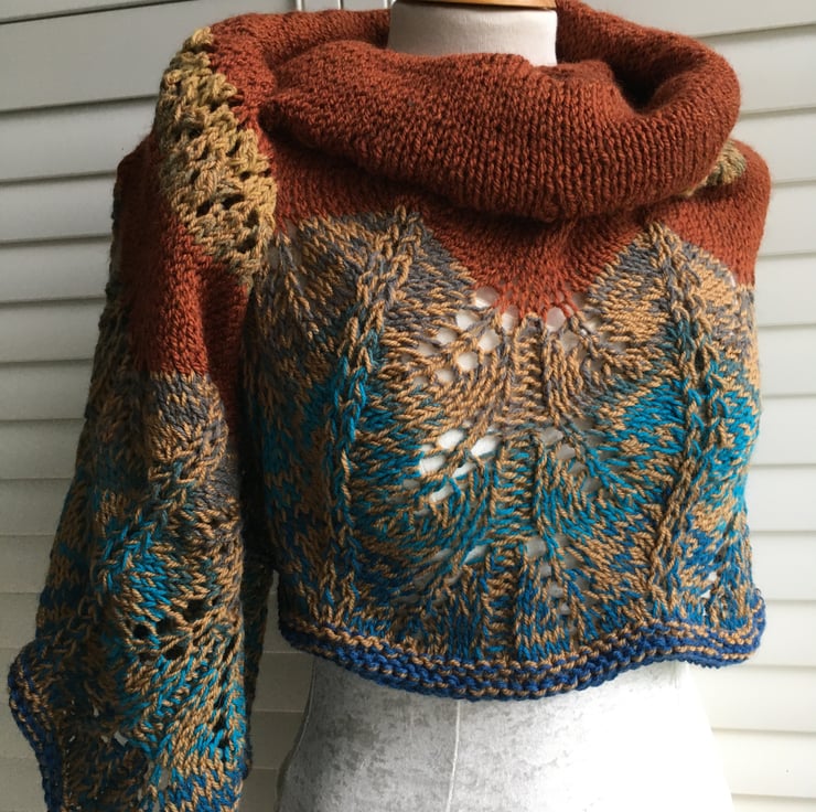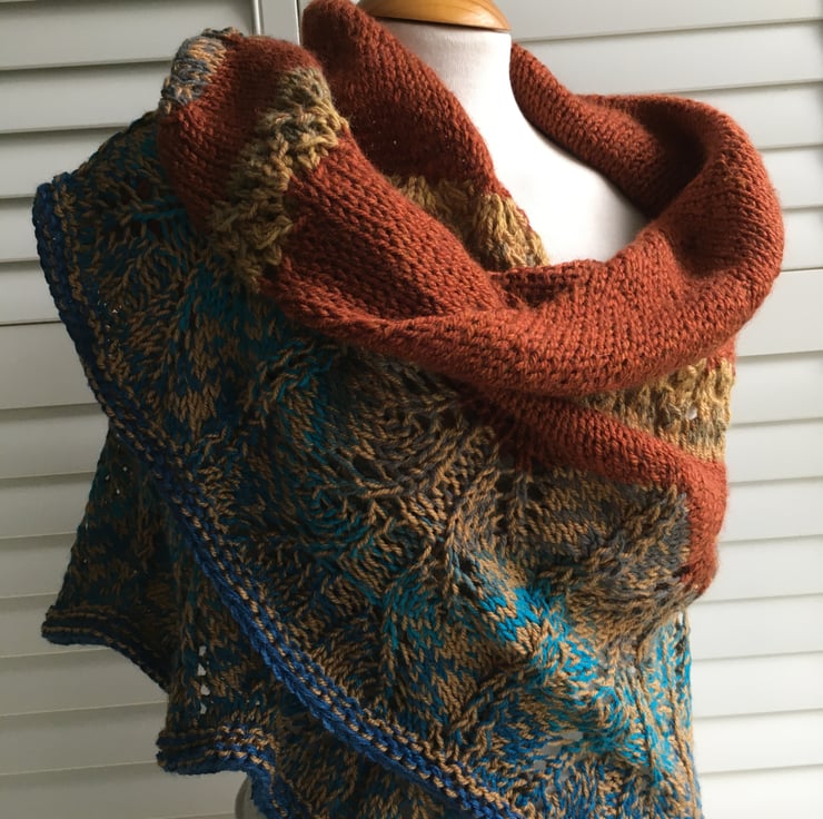 This last one just off the needles includes Aran weight yarn with 30% wool in rusty and camel brown together with a cake yarn that includes blues. The finished fabric is soft