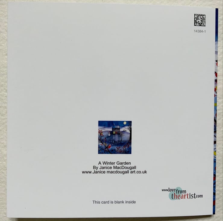 This card has been printed from an original painting that I did, featuring a nighttime scene of a cottage and a Robin in winter fields. It is a blank greetings card, It measures 14.5x14.5 cm and comes with an envelope.