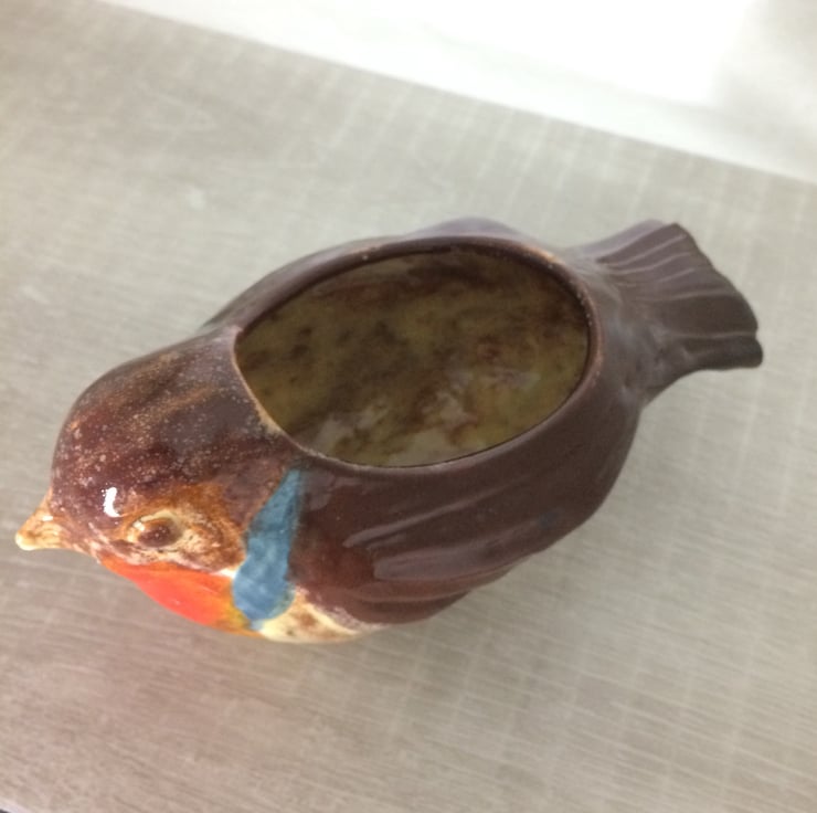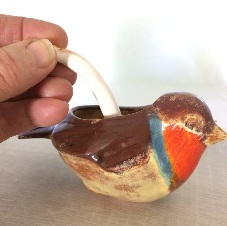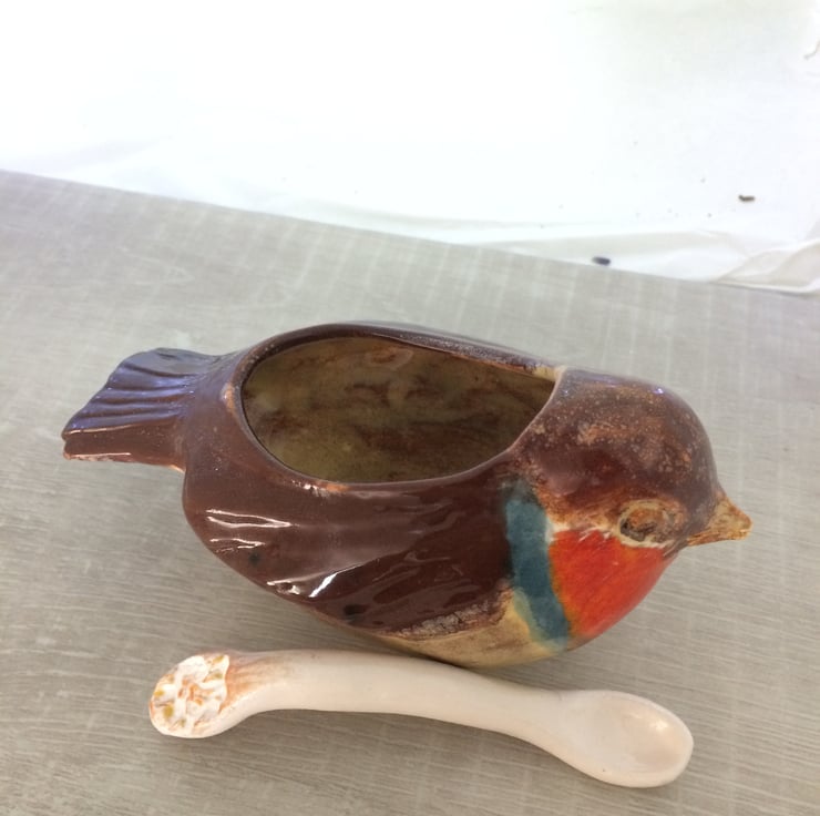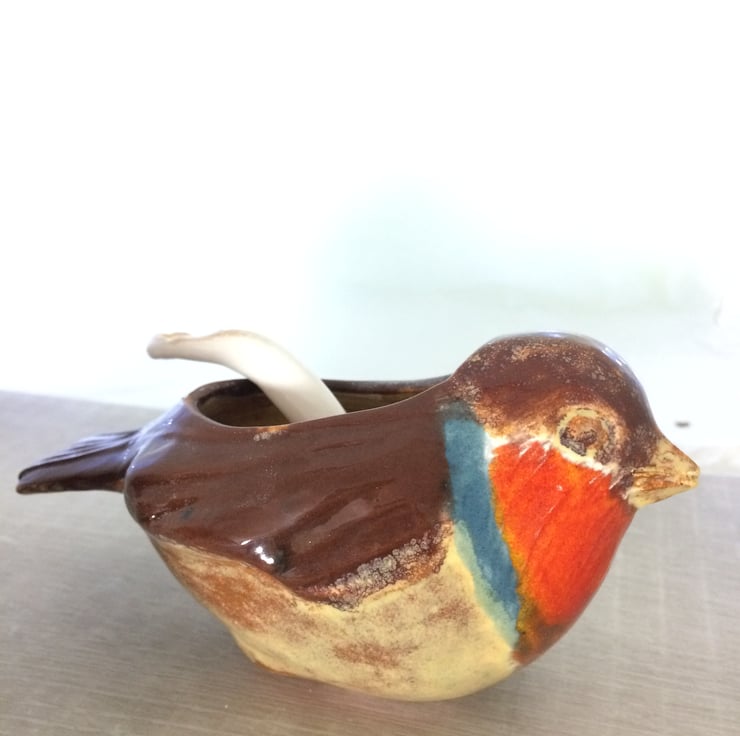 Handmade ceramic robin , small container for salt,sugar or mustard, complete with special spoon. or could be used as part of a decoration to hold small peices of greenery or holly, just the thing to complete the Christmas table.