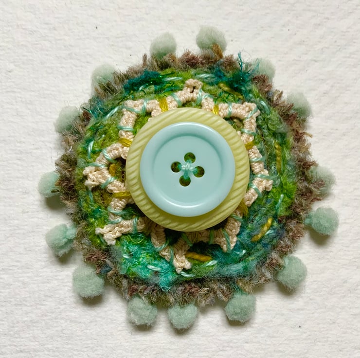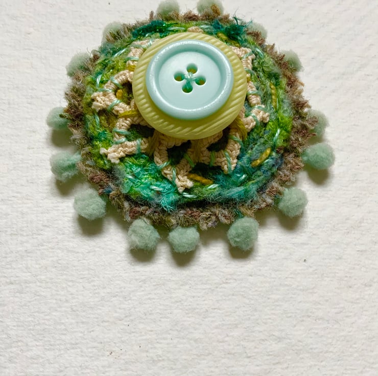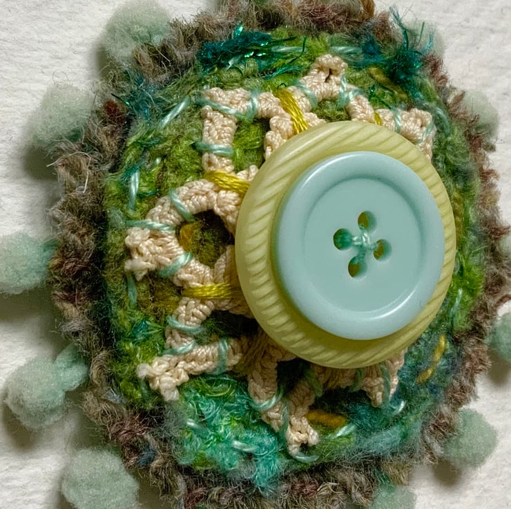 This brooch is hand made using Harris tweed, felt, fabric, bobble trim, embroidery and buttons. It measures 7cm across and comes with a standard brooch back sewn onto the back. It will brighten any jacket or jumper. Included in the second Sunday as an old design