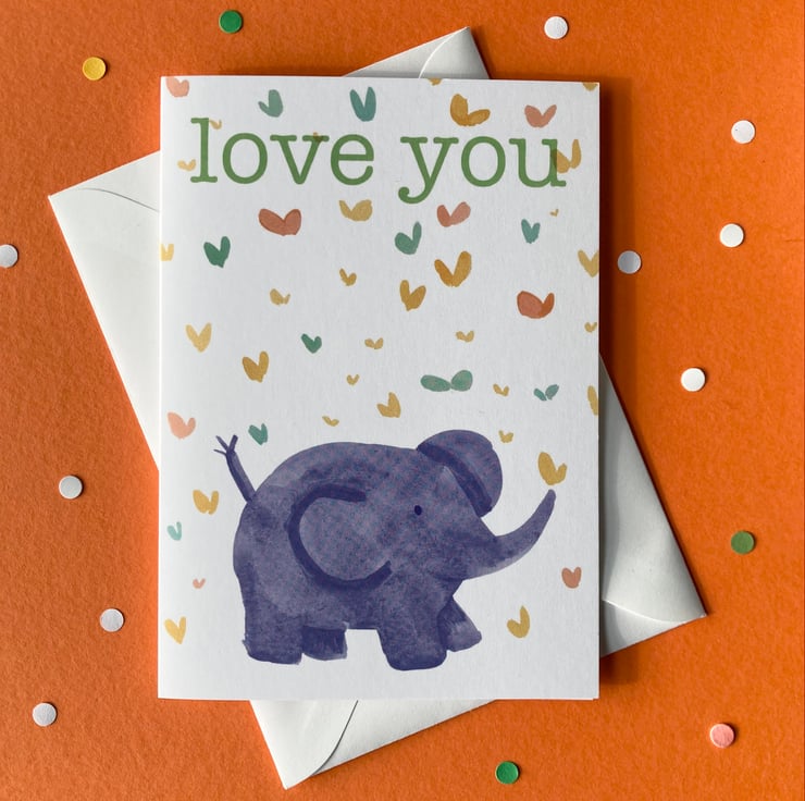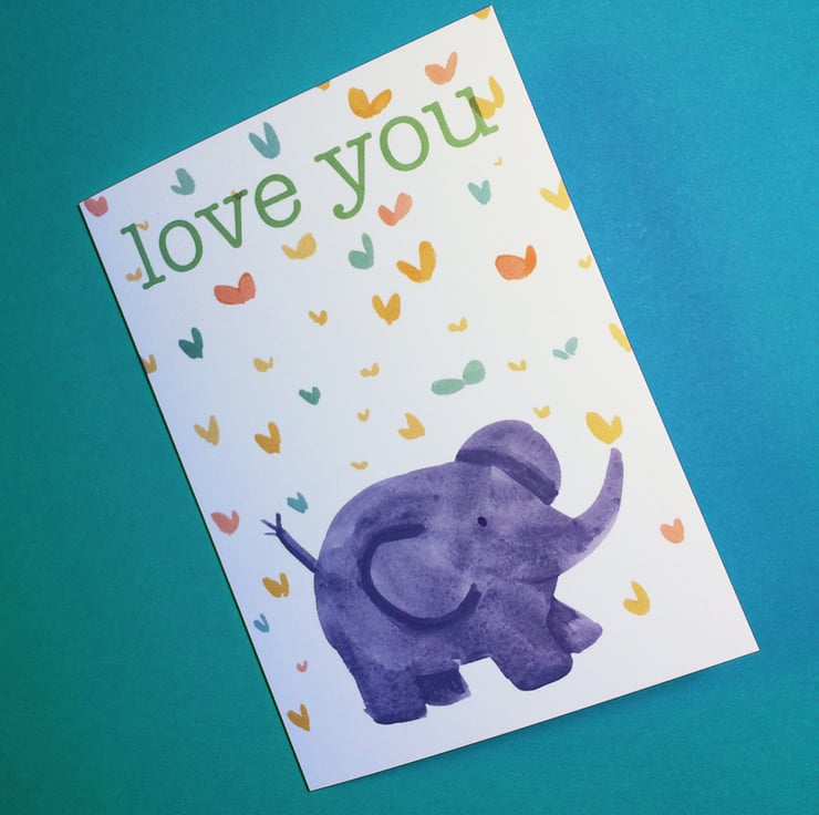 A new version of my popular baby elephant card, with Love You message at the top, blank inside for you to write your own message. Digitally printed from an original watercolour and gouache painting by Jo Brown, illustrator.