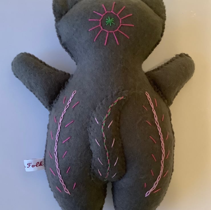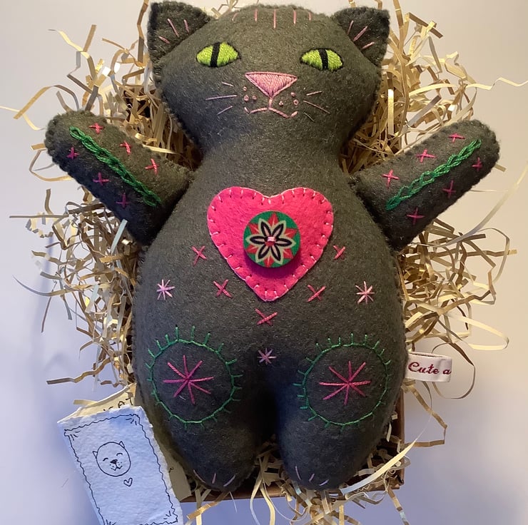 Trueheart is completely handmade from wool blend felt in an unusual colour - I’ve called it Moss Grey - in some lights it seems brownish, in others greyish and at times there’s a hint of olive! He has been lovingly hand embroidered and features a felt heart and painted wooden button on his chest. Like all the Dandycats he’s around 7.5 inches, or 19cm high and is designed and made by me in my Edinburgh home. Trueheart will be your loyal companion, but he is not a toy and not suitable for play.