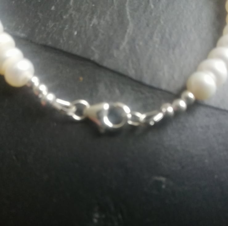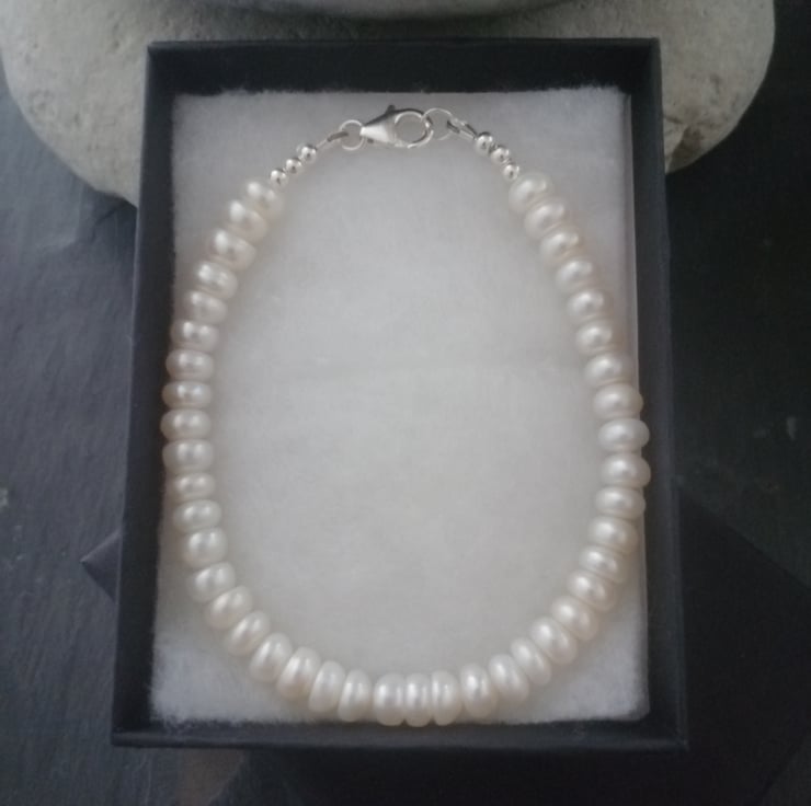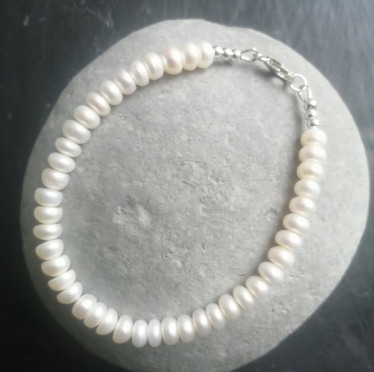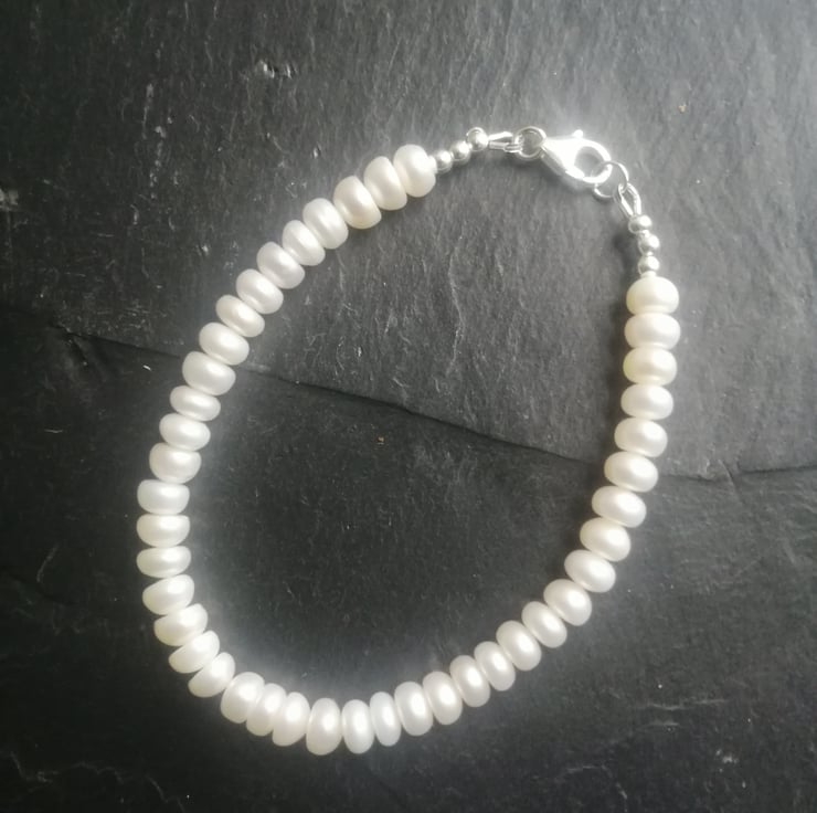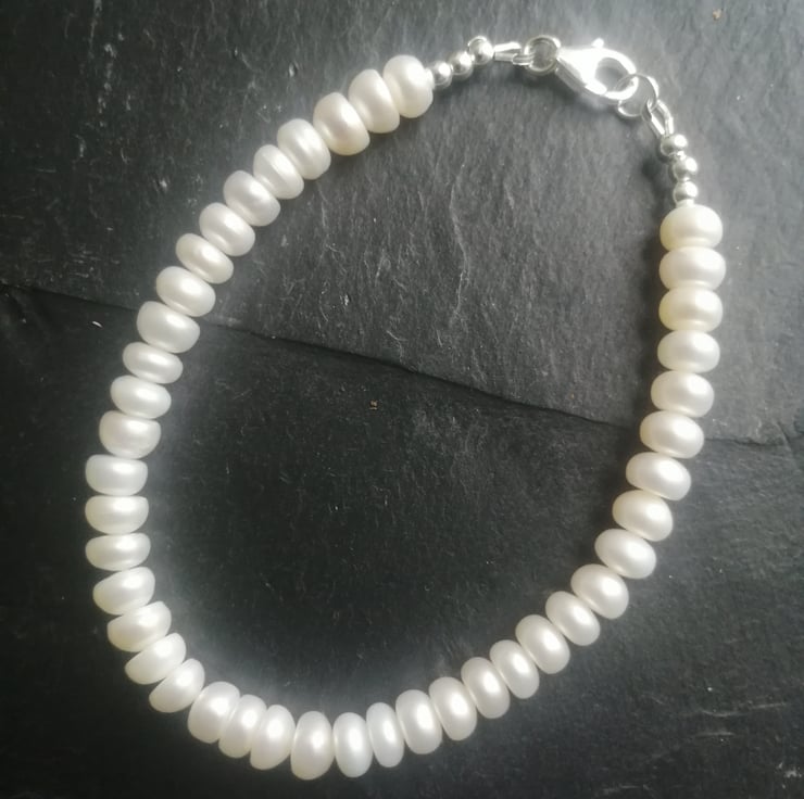 This beautiful bracelet is made with freshwater button pearls. It is fastened with a delicate filigree pearl clasp and all the metal components are sterling silver. It measures approx. 20.5cm in length. If you would prefer an alternate length, please contact me and I will do my best to accommodate your requirements.