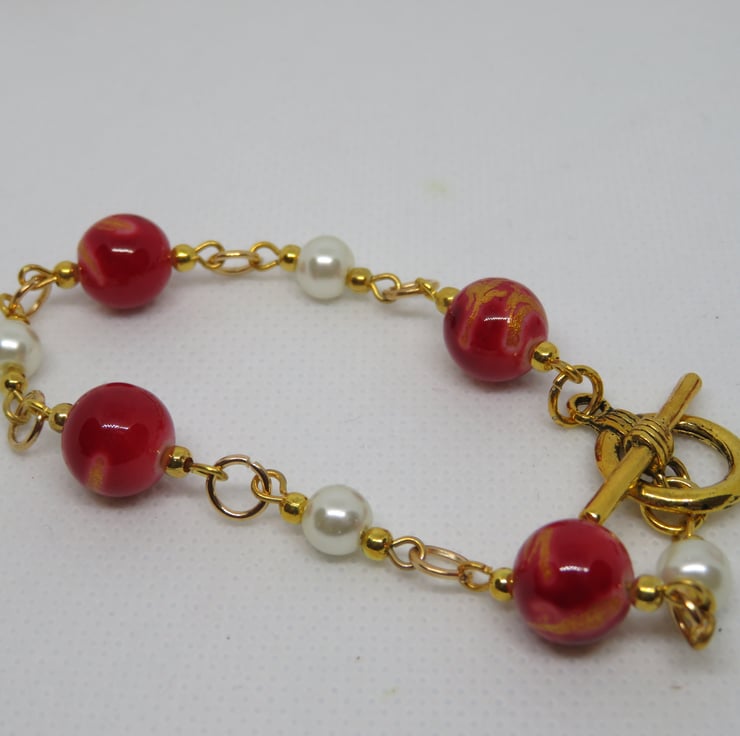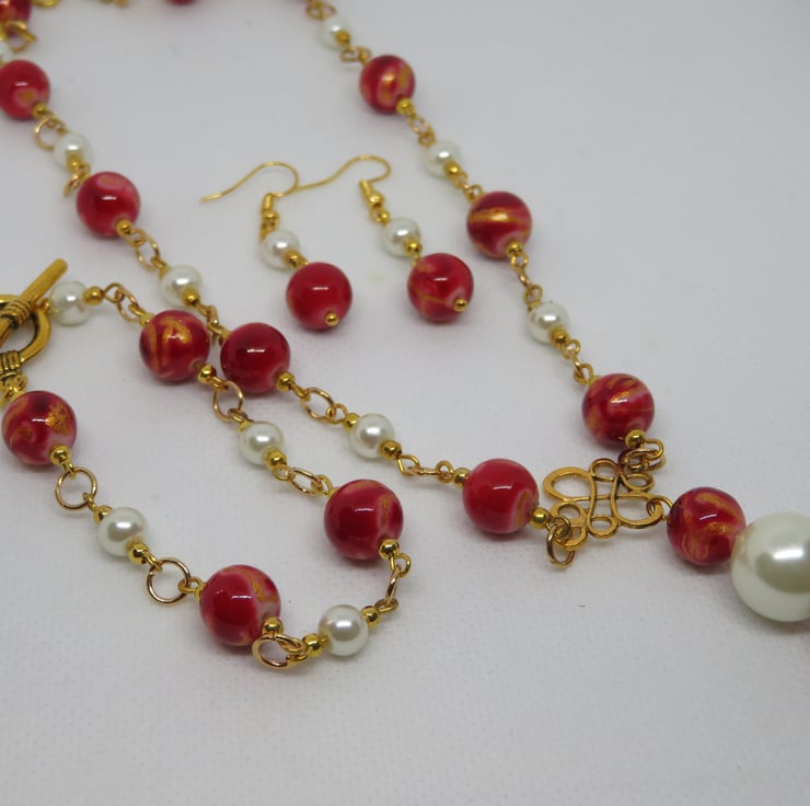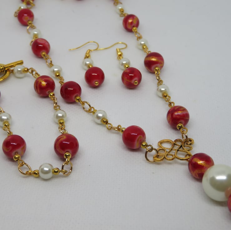 Beautiful red glass beads with a gold swirl effect meet white glass pearls in this cheerful set, comprising necklace, bracelet and earrings. The beads are threaded onto gold plated wire with gold seed beads and the 'links' are joined together with gold plated jump rings. There is a swirly gold plated connector on the necklace from which hangs a pendant featuring the red beads and a large glass pearl. The necklace fastens with a lobster clasp and the bracelet features a gold coloured toggle clasp. The earrings have gold plated ear hooks.