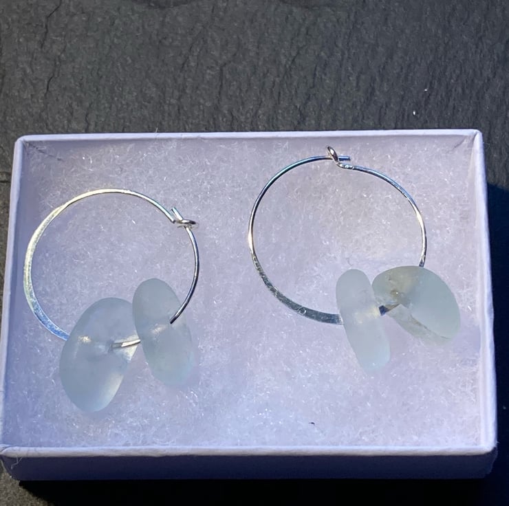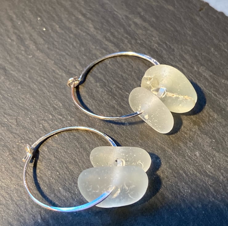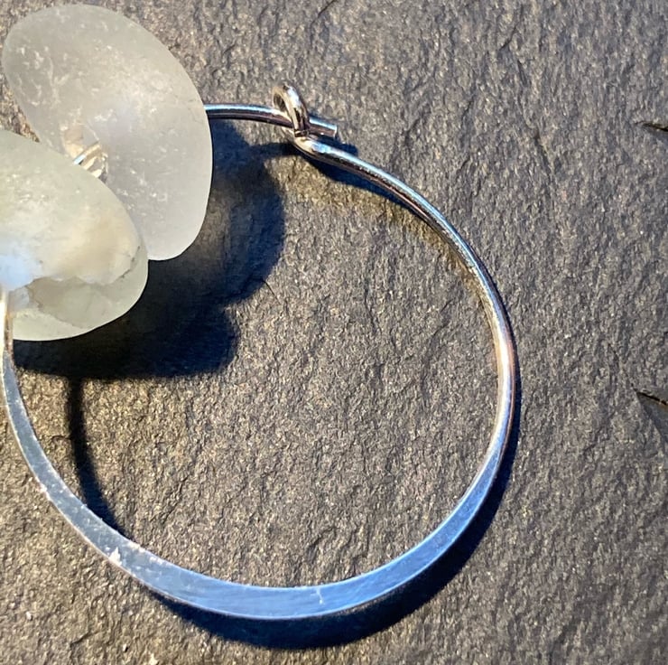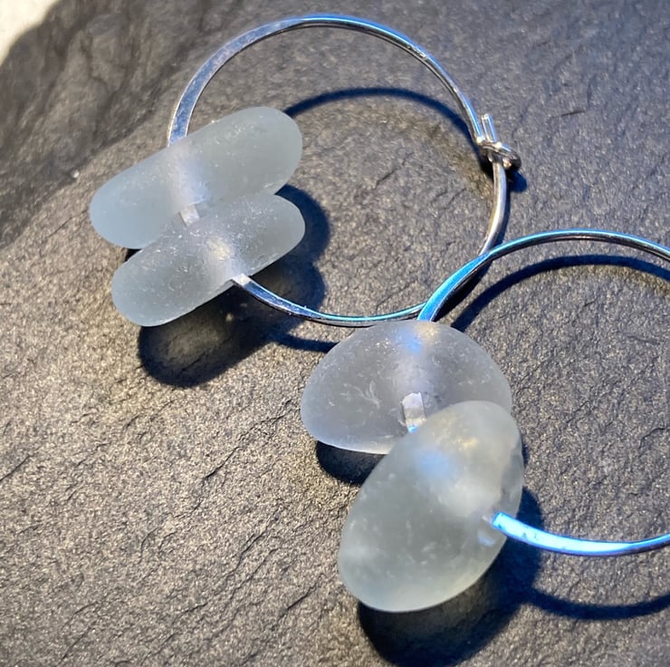 4 White Withernsea seaglass, near matching, pieces have been drilled and threaded onto a pair of sterling silver hoops, diameter approx 2cm to make a pair of unique earrings, suitable for any occasion.