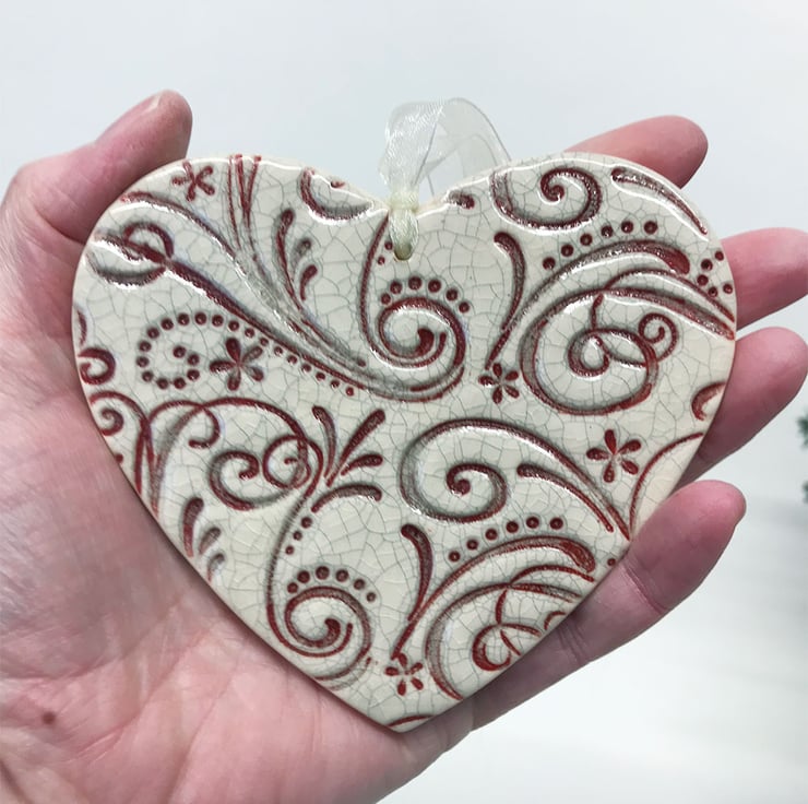 This ceramic heart decoration comes from my seconds box because I wasn't very happy with the red colour .Please look at the photo for details. It measures 11cm x 10.5cm