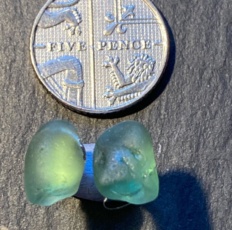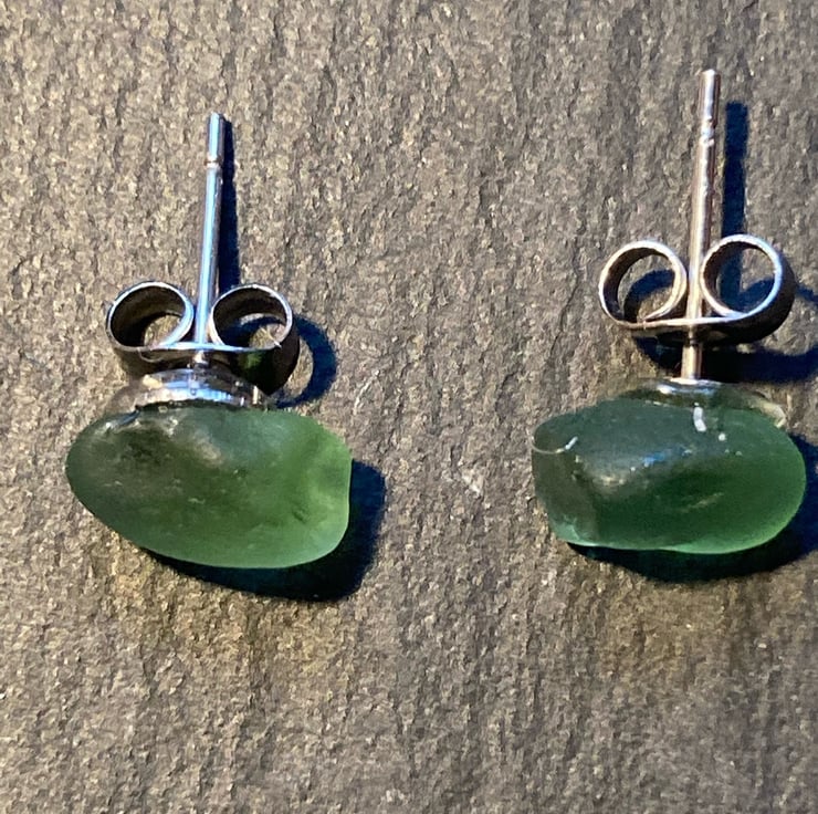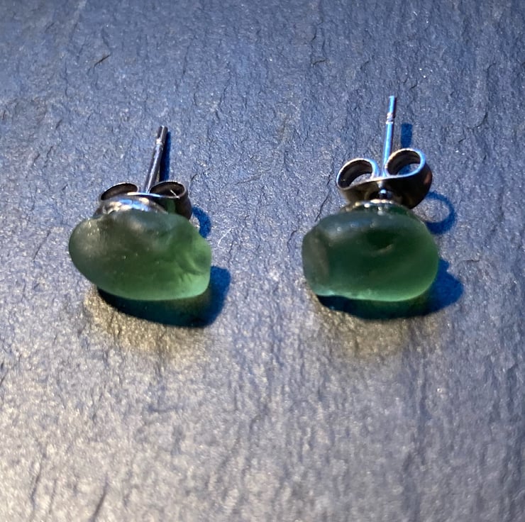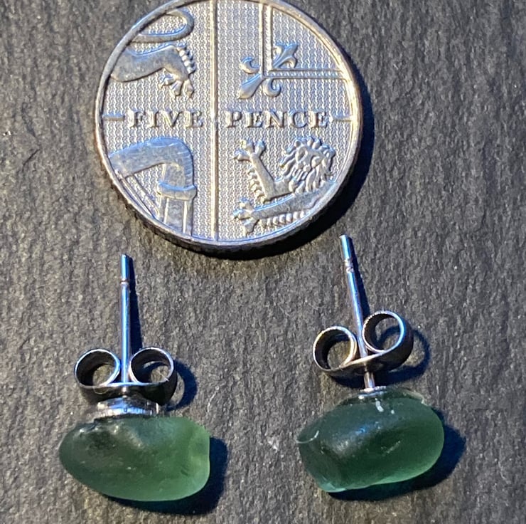 Green Seaham seaglass pieces on surgical steel studs. Seaham glass is well rounded and these small pieces are approx 0.75 cm at the widest points. See photos to compare with a 5p piece.