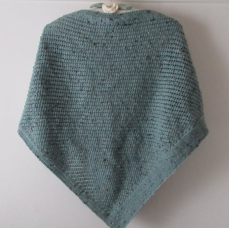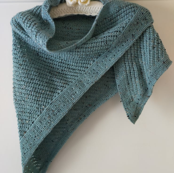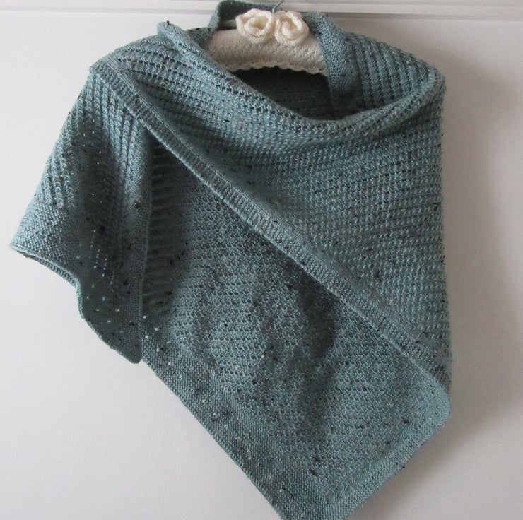 A beautifully hand knitted lace shawl wrap in duck egg blue coloured yarn, with coloured flecks in oat, caramel and chocolate brown throughout. It is hand knitted in a small diagonal all over cable stitch, lending an openness and texture to the shawl. One side is finished in 2" of lacy garter stitch with two rows of eyelets. It is a perfect size and weight to throw over your shoulders when the evenings get chilly.