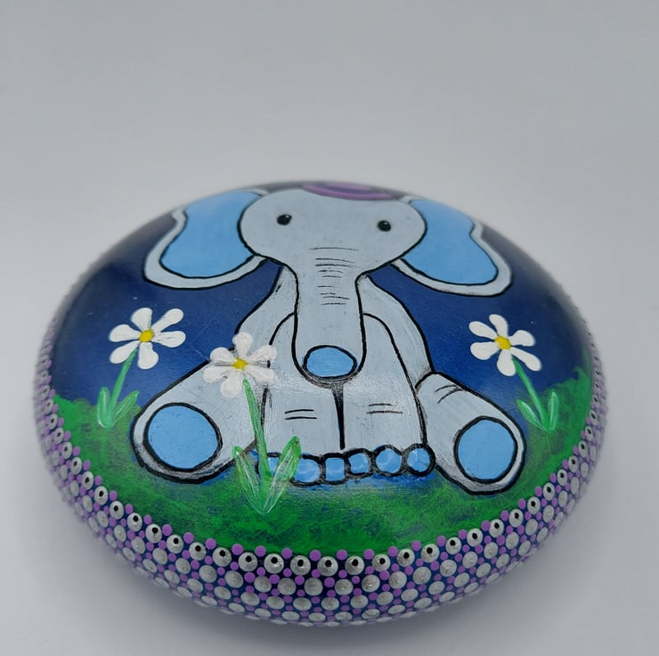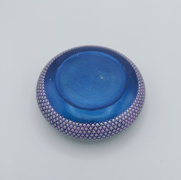 Painted in acrylic paints and sealed in a satin varnish, the stone measures 10cm in width and 3cm in height.