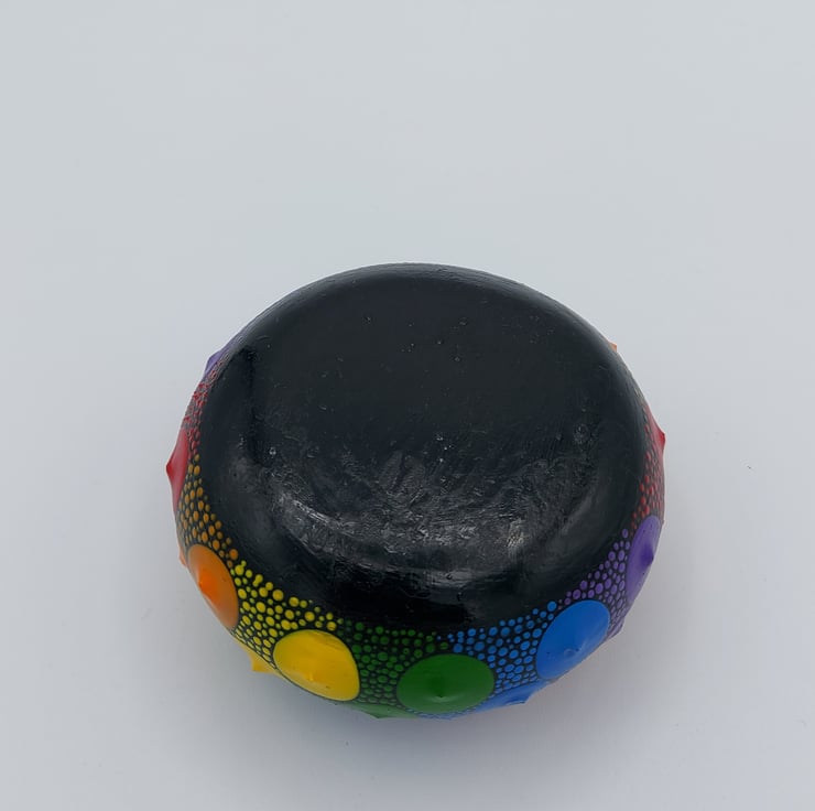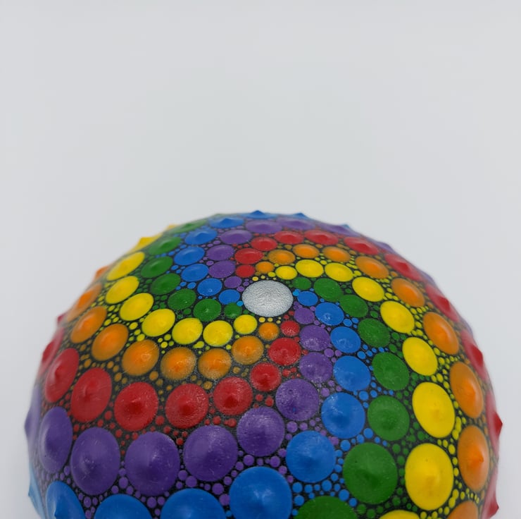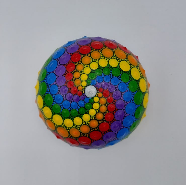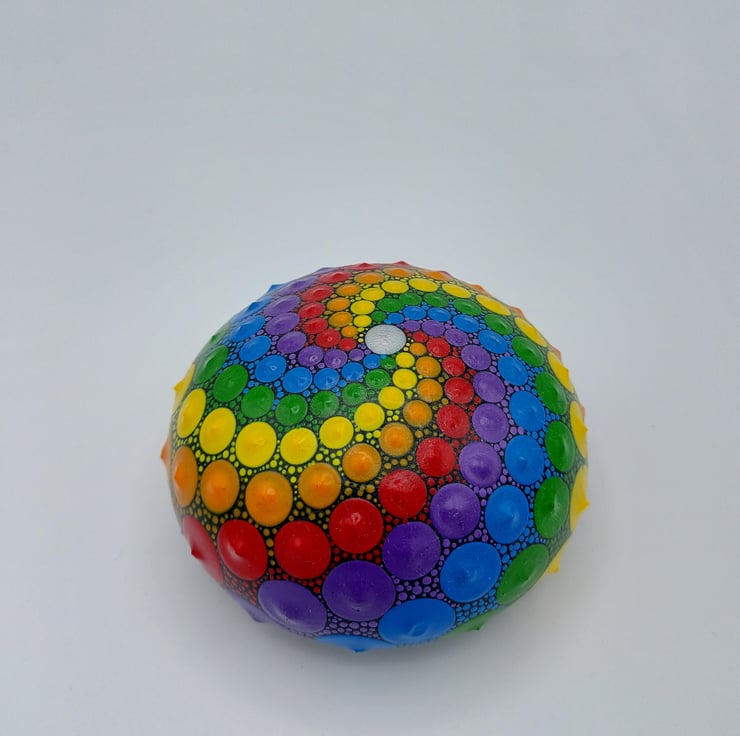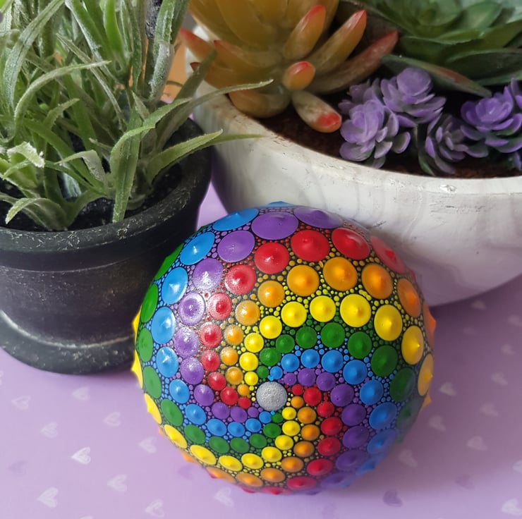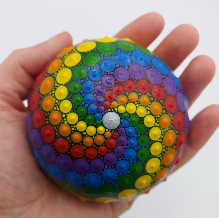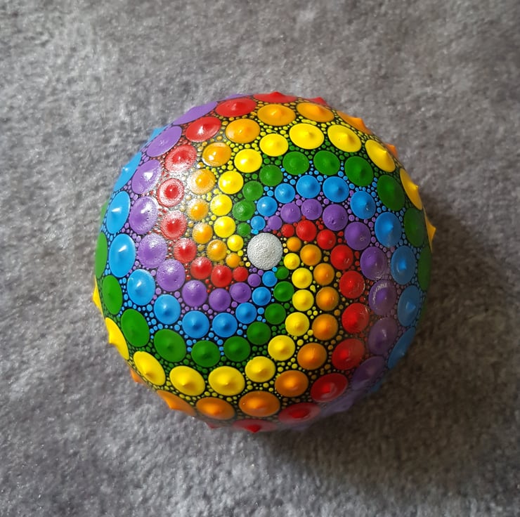 The dots on the stone have been painted in a way that has left points in the centre of the dots, and that gives the stone a wonderful texture to touch and run your hands over.