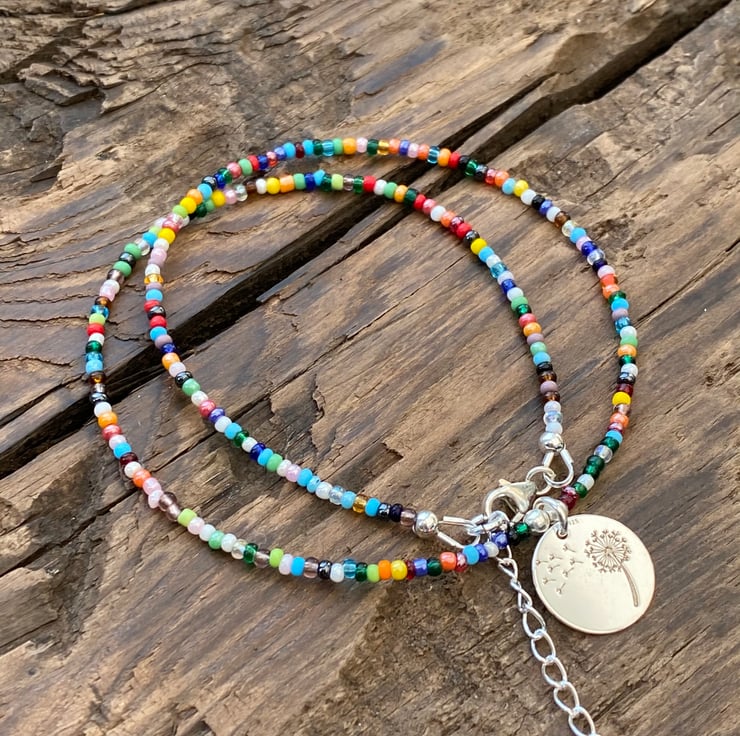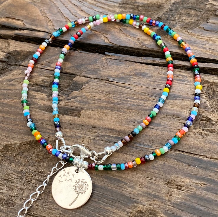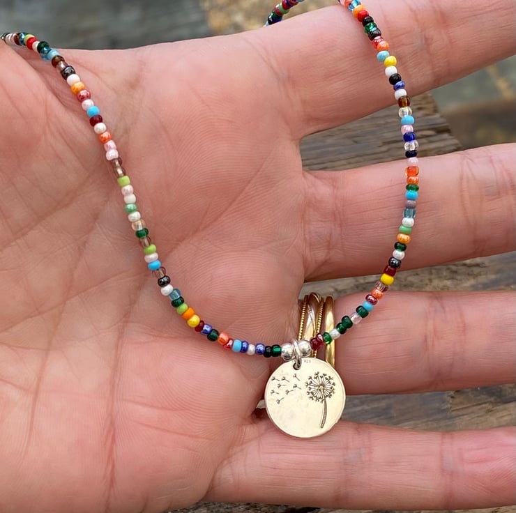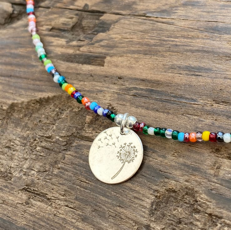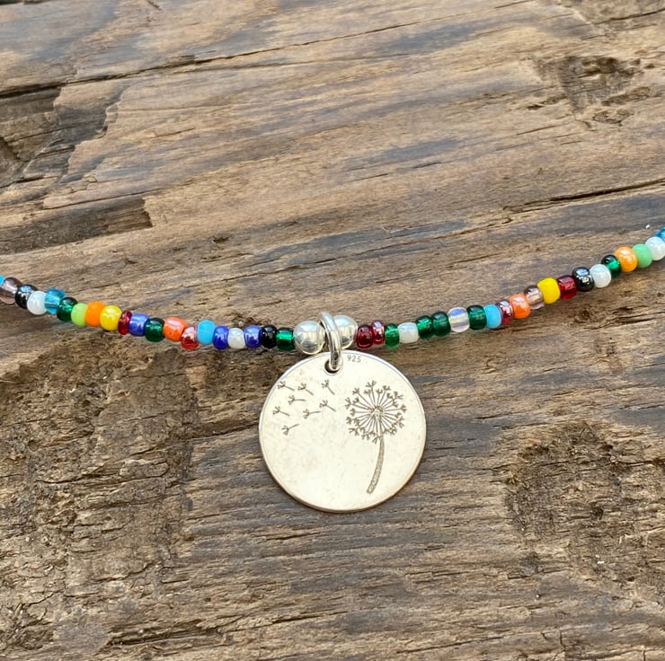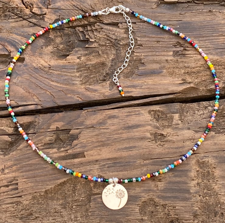 Choker necklace made with a mixture of coloured Miyuki seed beads on strong tiger tail wire. Finished with a sterling silver disc stamped with a dandelion seed.