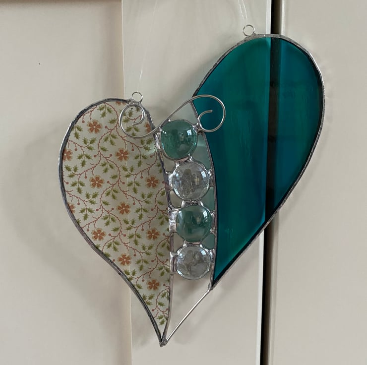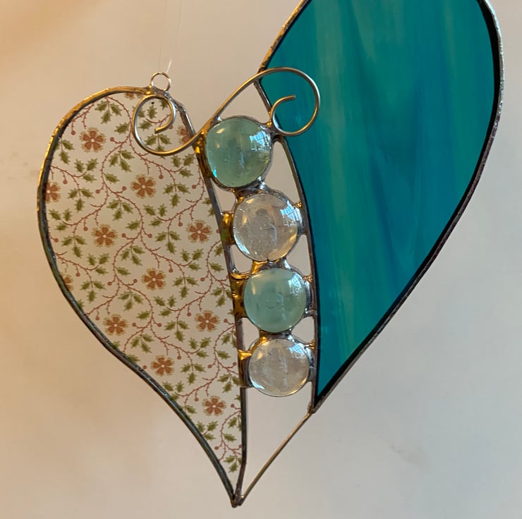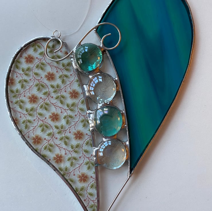 A beautiful 2-piece heart made using the Tiffany (copper foiled) method of stained glass. The glass used is a beautiful aqua mix and a pretty pink and green flowery glass.The two halves are divided by 2 Aqua glass nuggets and 2 clear glass nuggets and these are topped with an elegant wire curl.