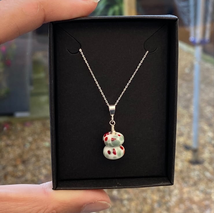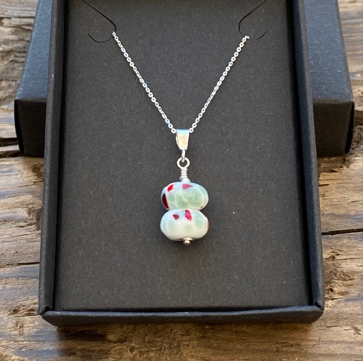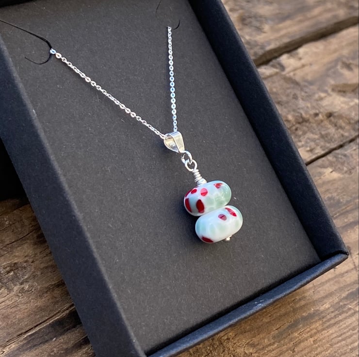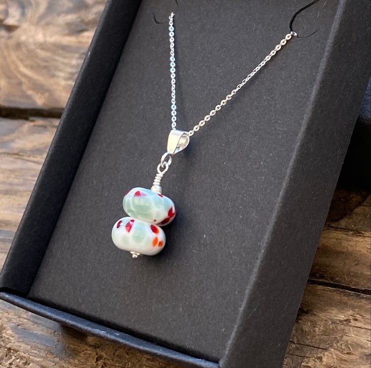Two cute little UK made lampwork beads have been hand wired onto a sterling silver headpin with a silver bead. Hung from a an adjustable necklace by a silver bail.