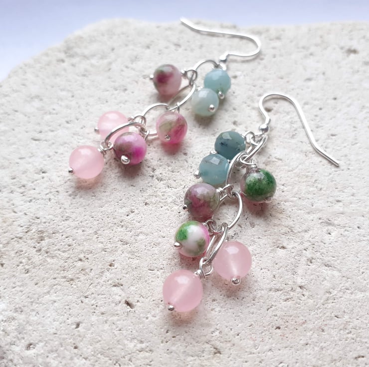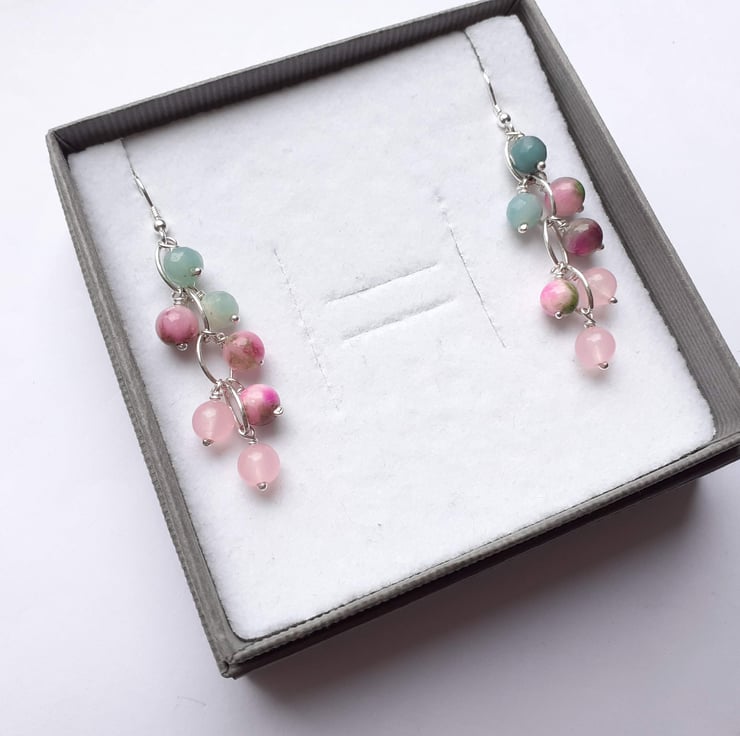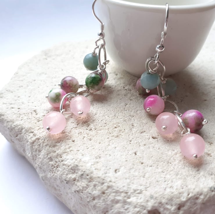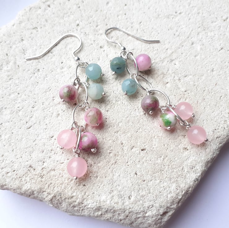 Amazonite, jade and rose quartz waterfall earrings with handmade recycled sterling silver hooks.