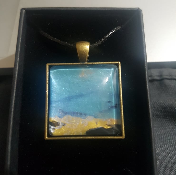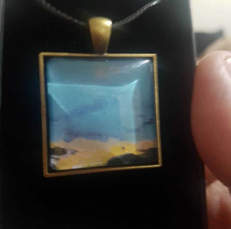 To create an unusual unique pendant using fantasy pebeo paints. This is simple has a semi abstractfeel but also seems to me like a mysterious beach. Beautiful sheen from the blue and gold.
