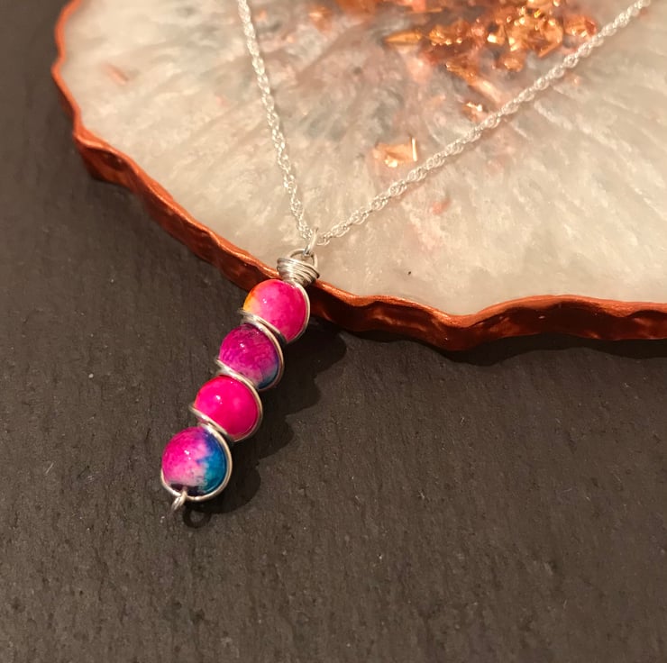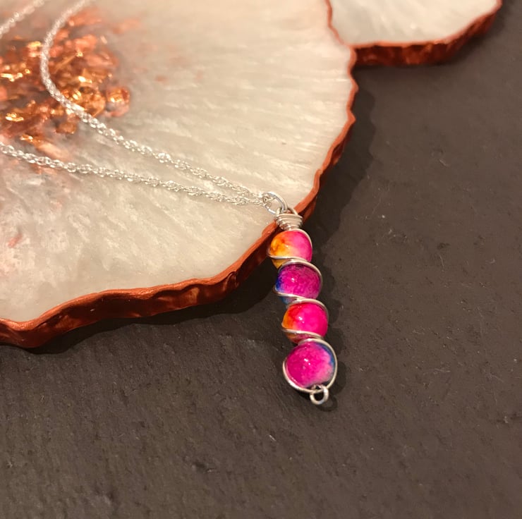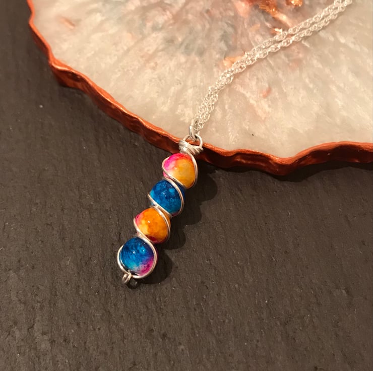 Cosmic Swirl Pendant and chain. Silver plated wire, Sterling silver 16ins necklace, 4 pink cosmic swirl glass beads.
