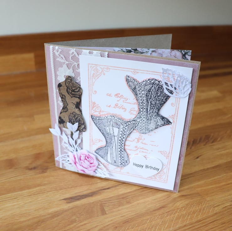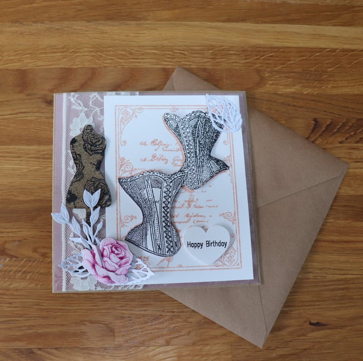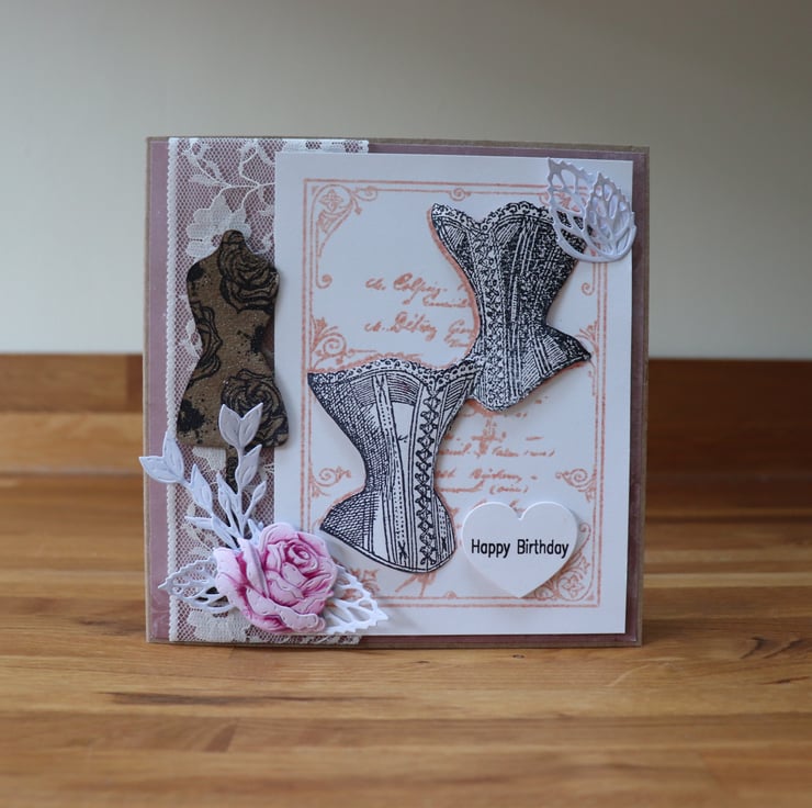 This card has a vintage Matt and layer of paper and card and lace that has been stamped and layered with two vintage corsets, there is a dress makers manikin that I have stamped with roses and heat set with a gloss embossing powder, to finish the card I have used a decoupage rose with leaves. This card is blank inside for your special message.