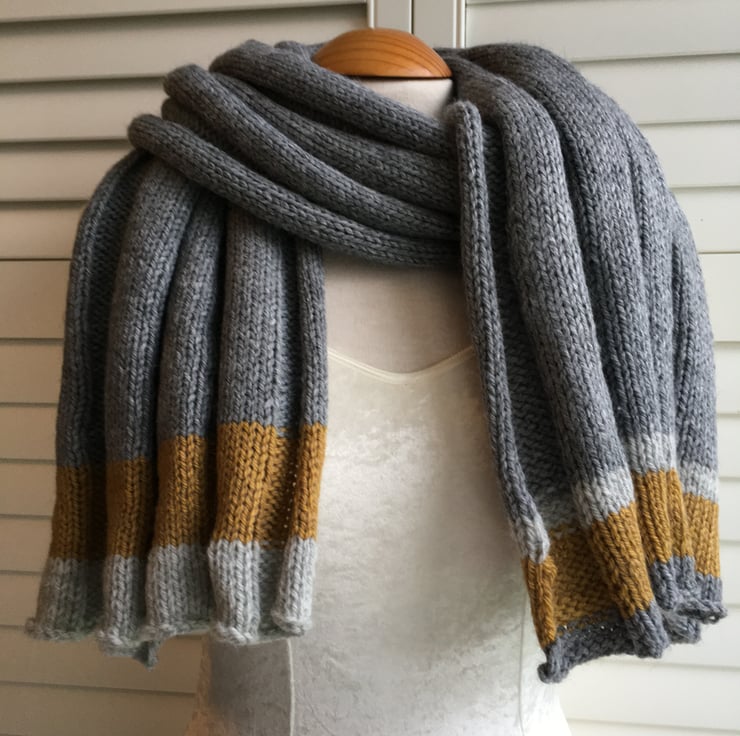 This aran weight yarn is butter soft. The greys are 25% wool to 75% acrylic while the ocher yarn is 30% wool to 70% acrylic.