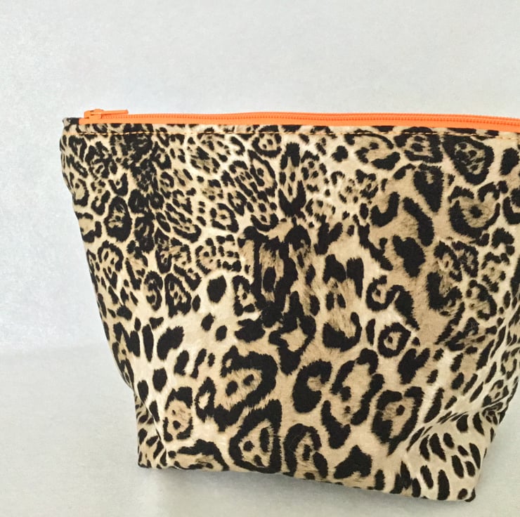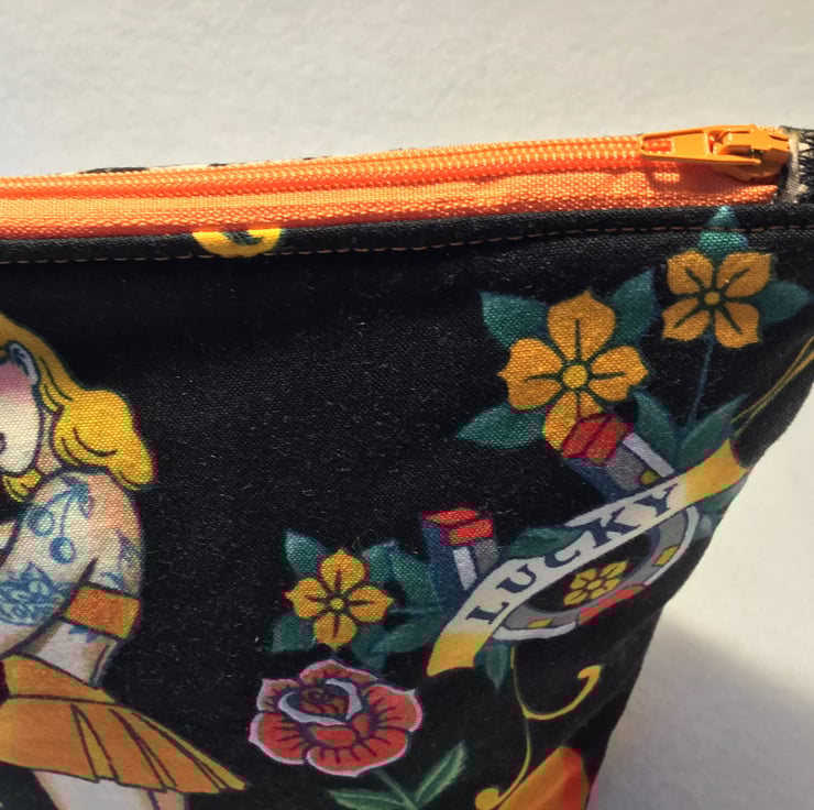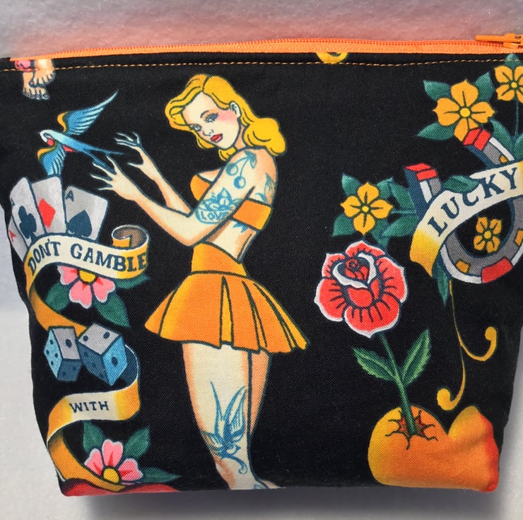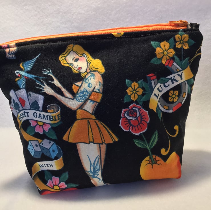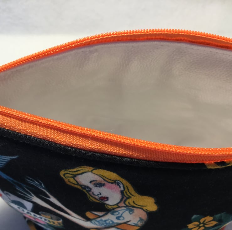 Make up bag in a Tattoo fabric by Alexander Henry with a PUL waterproof lining which is also food safe. I have made the back of the bag in an animal print for added interest. The bag is machine washable at 30o with a low spin.