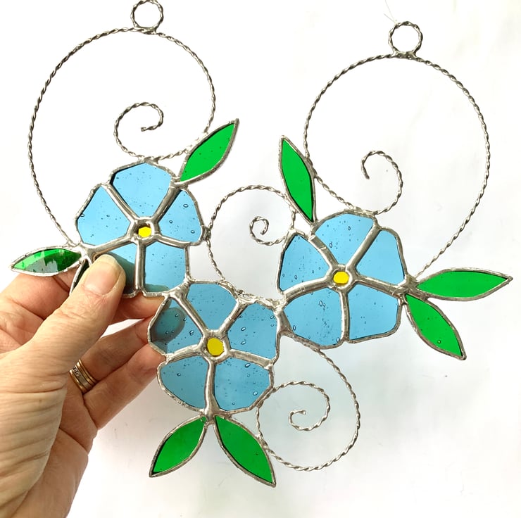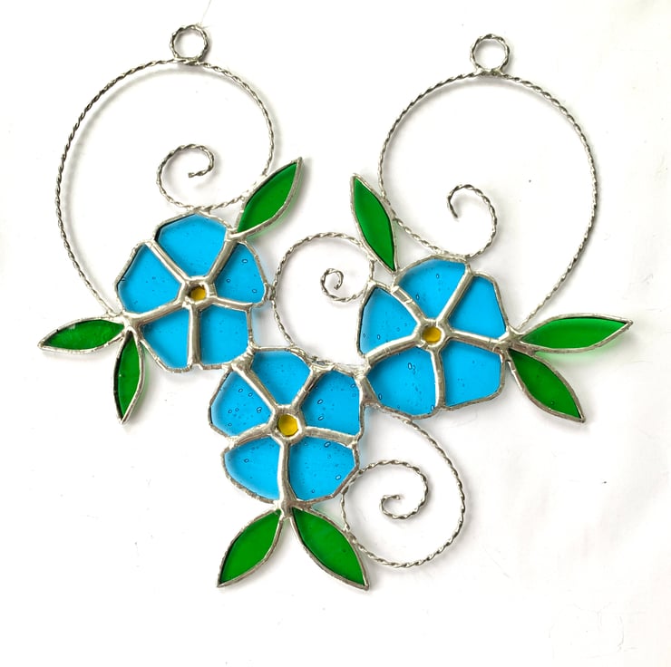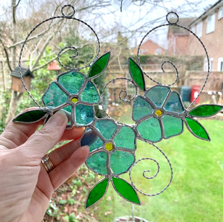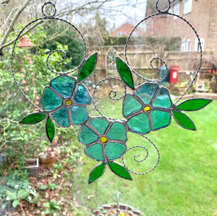 Each piece of glass has been hand cut, ground, foiled and soldered together before a final wash and polish. The glass used in this suncatcher is a pale sky blue sea glass for the petals and yellow rough rolled glass for the centre. The leaves have been made from a green sea glass. Tinned copper wire has been twisted together to form scrolls have been added for interest and finishing line for hanging purposes.