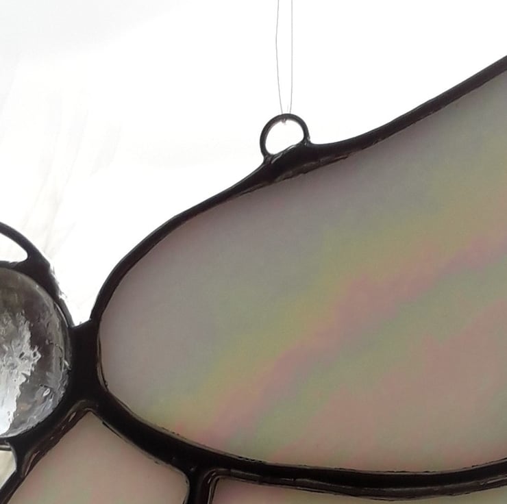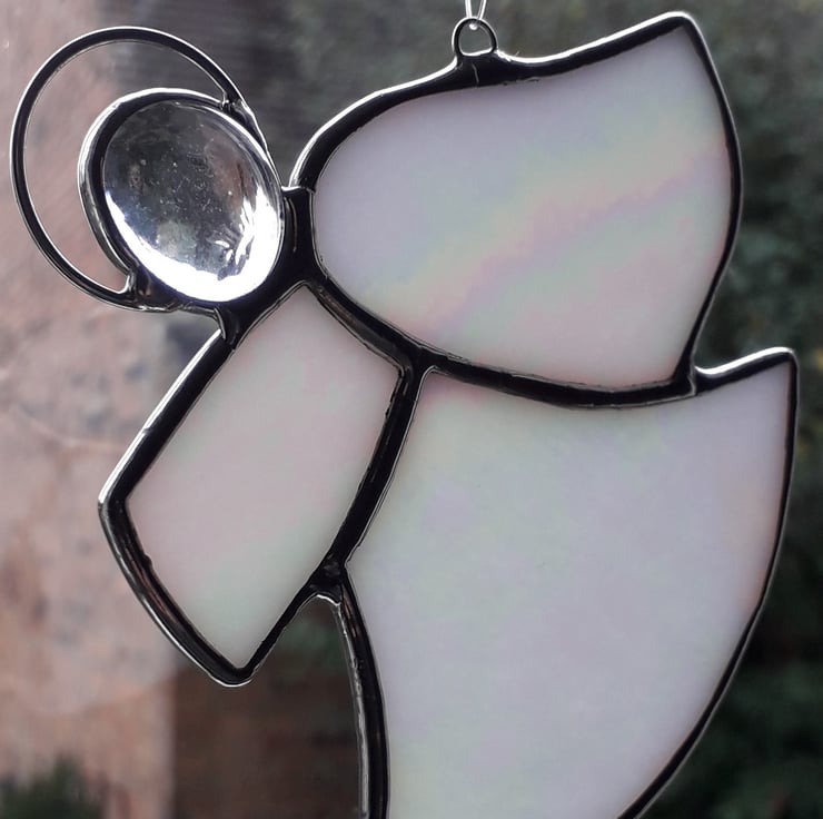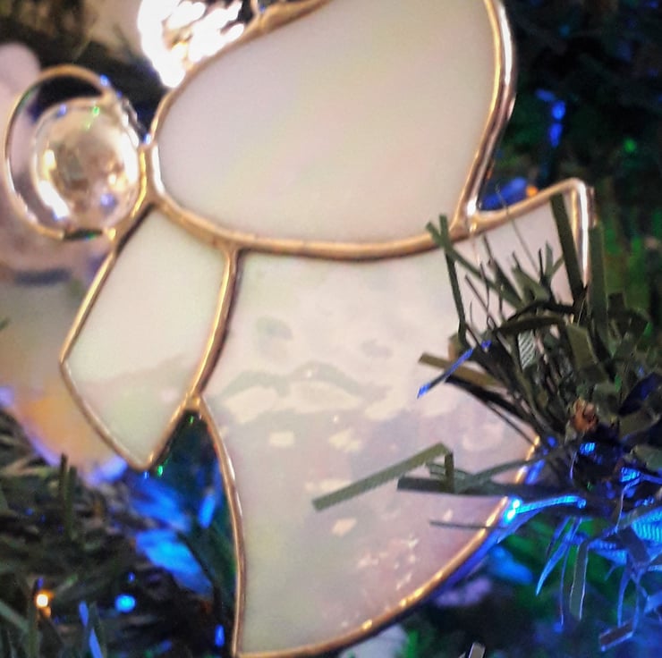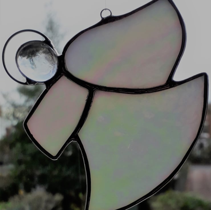 Our stained glass angel is hand-crafted using an iridescent opal glass that is the colour of pearls and changes in different lights. It will look lovely hanging where the light shines and especially on a Christmas Tree. All the pieces are cut by hand and the edges are wrapped in copper foil tape which is burnished to the glass. The pieces are soldered together and topped with a glass globule and halo. The finished angel is then polished and a hand-tied loop is added so it is ready for you to hang in your chosen place.