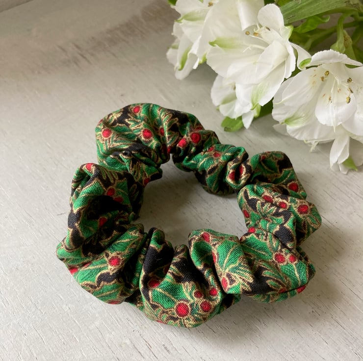 A fabric hair scrunchie handmade with lovely festive holly material.