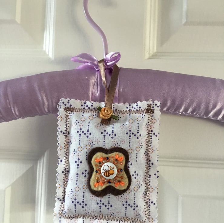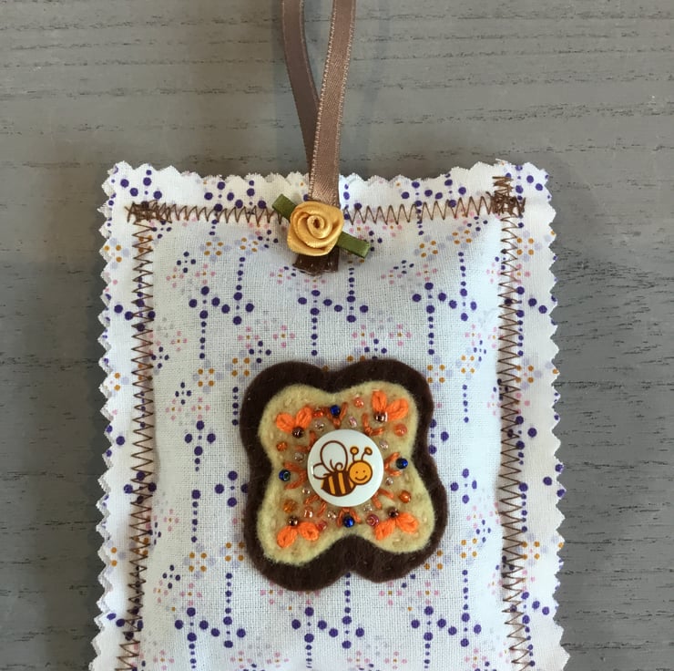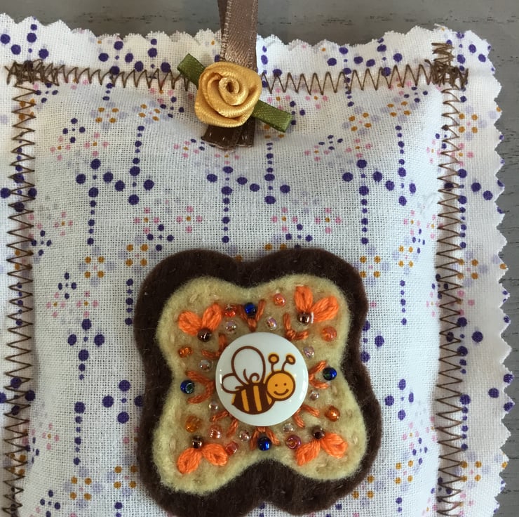 This fabric lavender bag has a hand embroidery in the centre. A button with a little smiling bee is sewn onto a background of yellow and brown felt. Hand embroidered lazy daisy and herringbone stitches in orange and light brown threads, dotted with blue, bronze and golden seed beads surround this happy bee.