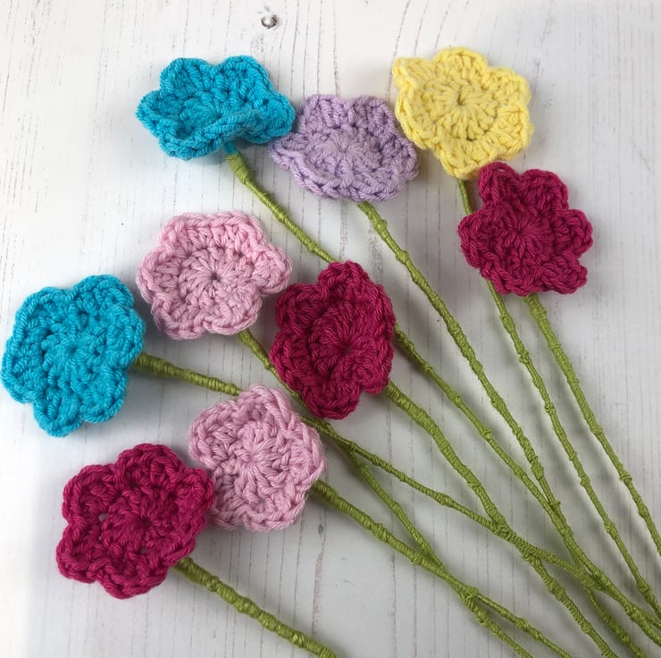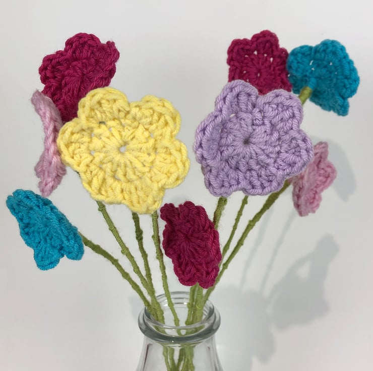 This listing is for 1 bunch of crocheted flowers (vase not included). There are 9 flowers in this bunch and this is the bunch you will receive. Each flower head has been crocheted from premium acrylic yarn and is attached to a floristry wire. The wire has been wound and bound with acrylic yarn. The smallest flower is about 26cm tall and the tallest is about 36cm.