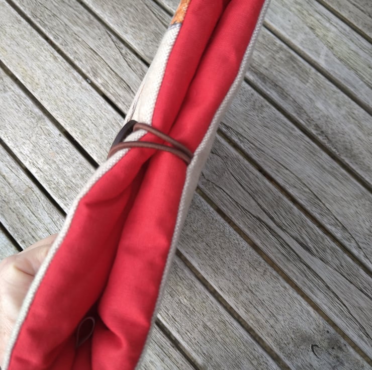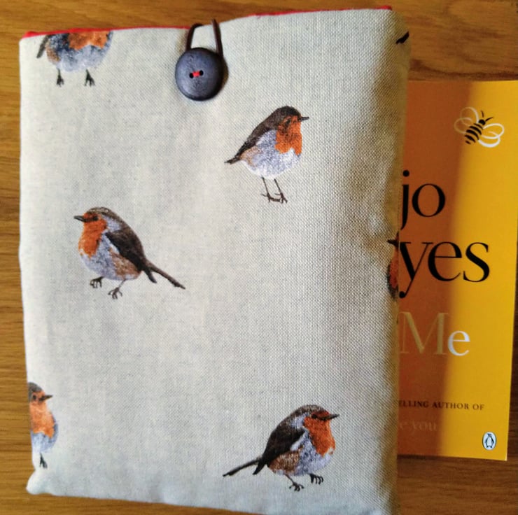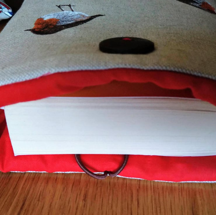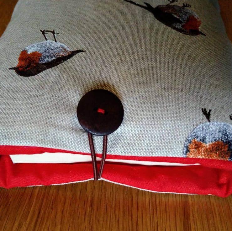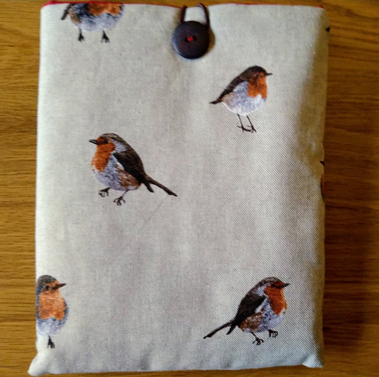 This is a handmade book sleeve/cover in a robin design on a linen blend fabric. It is padded with wadding to protect your book and lined in a contrasting red cotton fabric. There's an elastic loop over a button to keep it closed. This will fit a paperback book or a similar size hardback, or a small tablet.